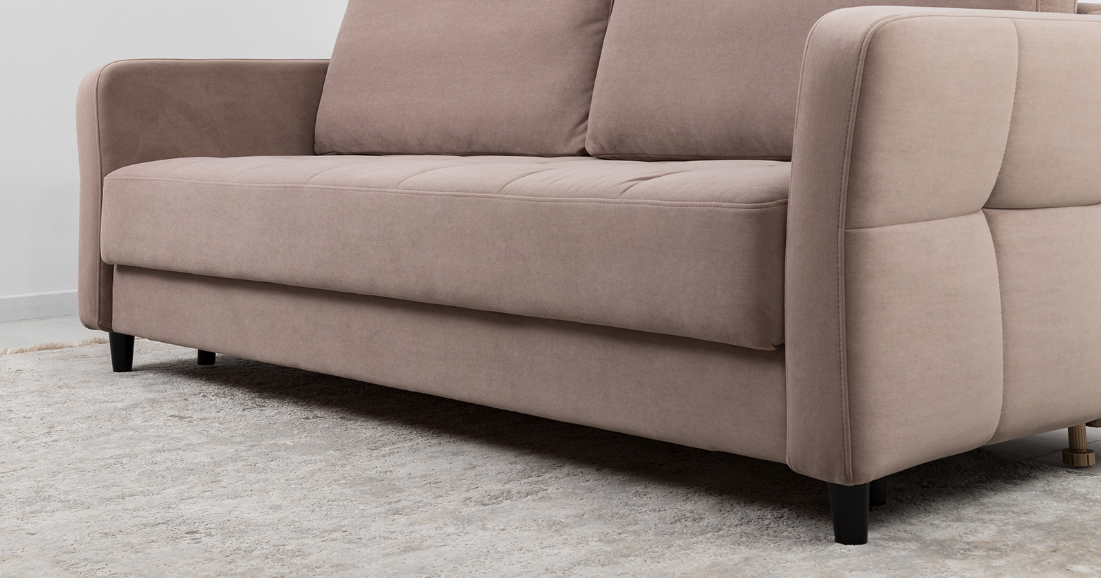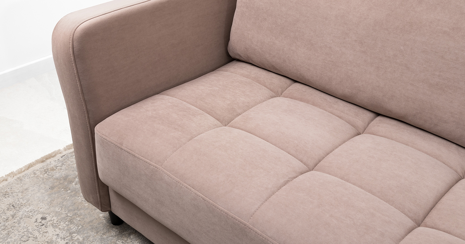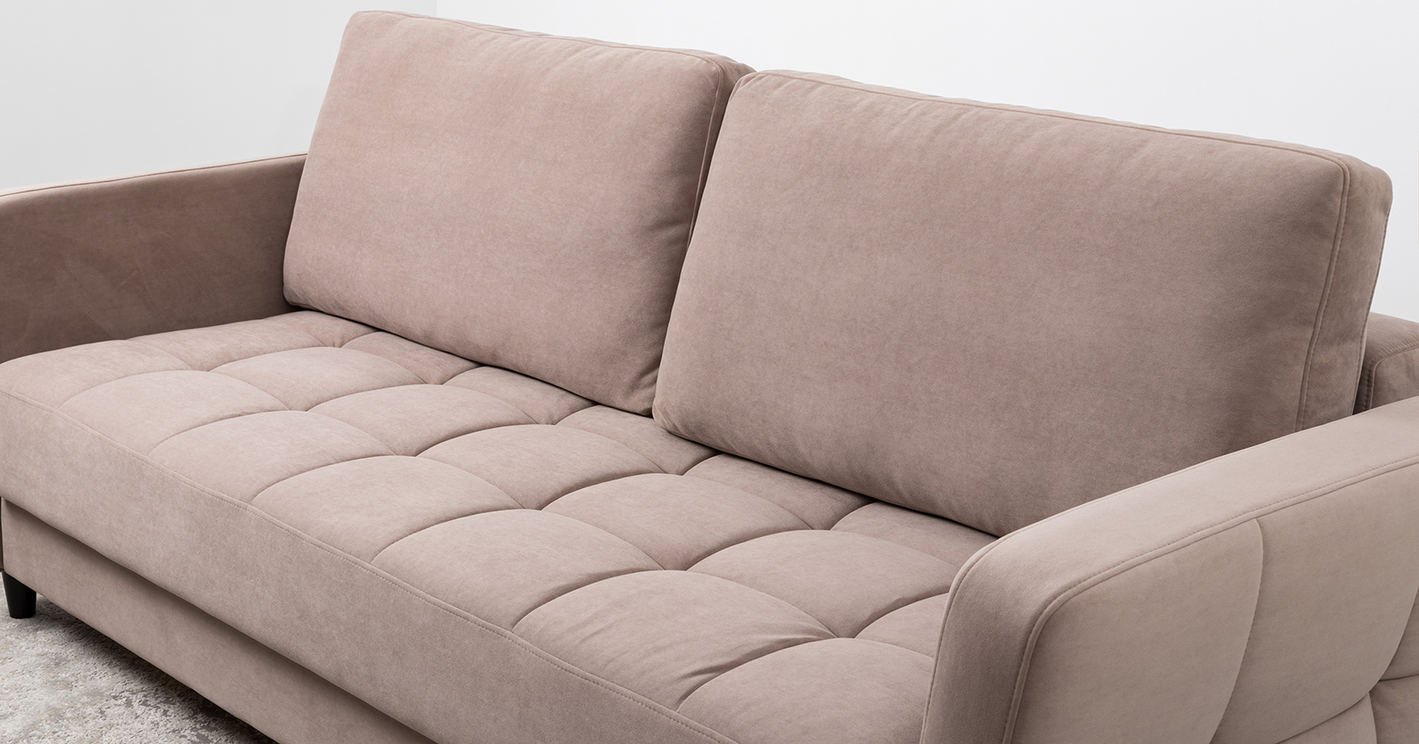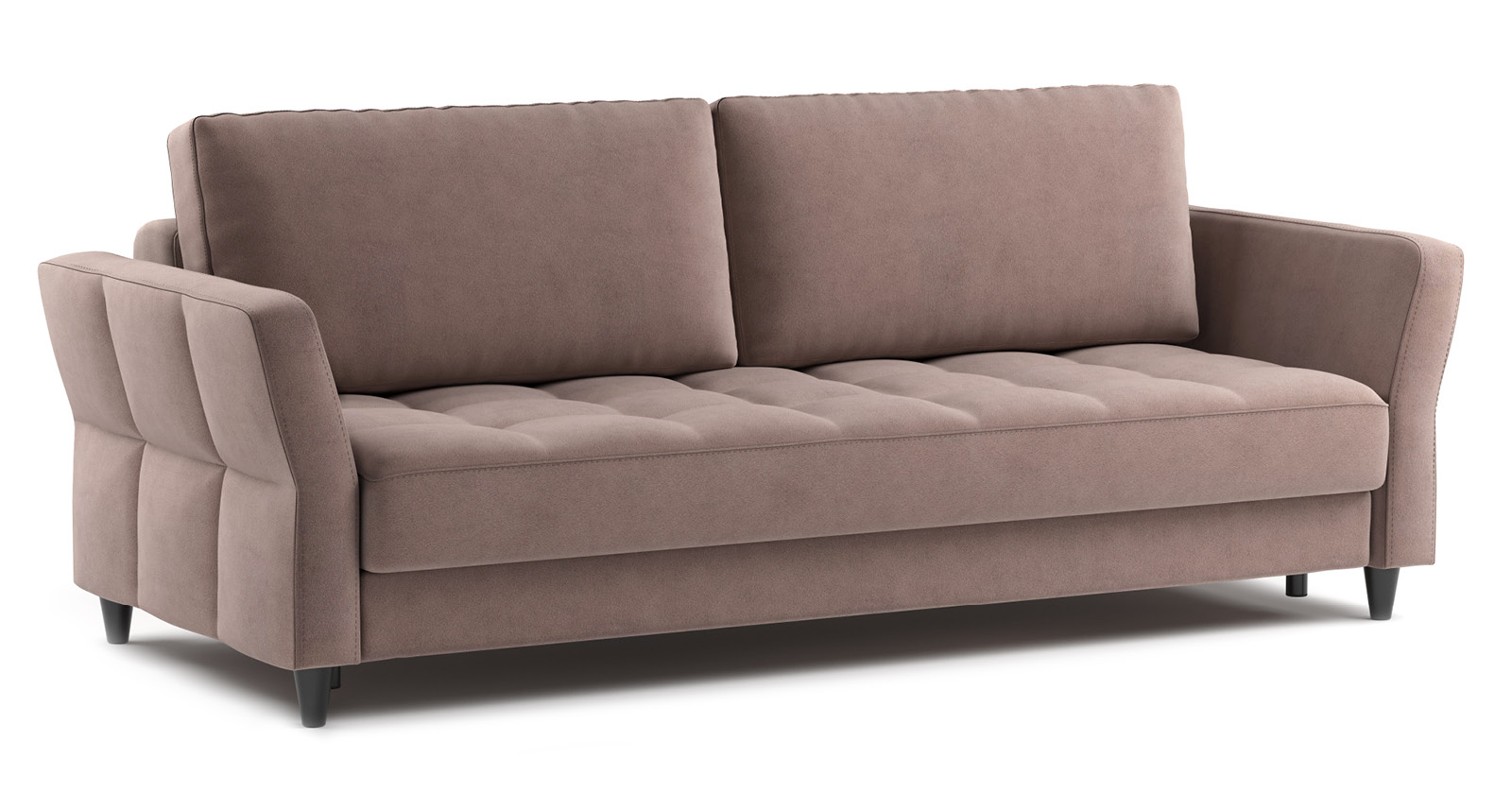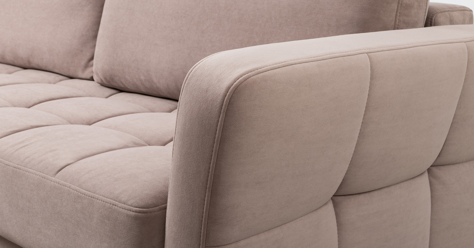 Ровная отстрочка по всему периметру сидения и стежка? создающая эффект пышности выделенных форм. Подлокотники прямые с изгибом в наружные стороны, с выраженной стежкой по лицевой стороне. Стежка на посадочной части дивана.