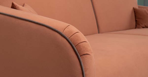 Спинка и сиденье разделяются пополам двойным кантом по центру и одинарным по краям сидения, для придания одной единой формы. Подлокотники с изгибом на лицевой стороне и мягкими закругленным углом со складками, с выраженным контрастным ровным кантом по внешнему контуру изделия и изогнутой линией канта.