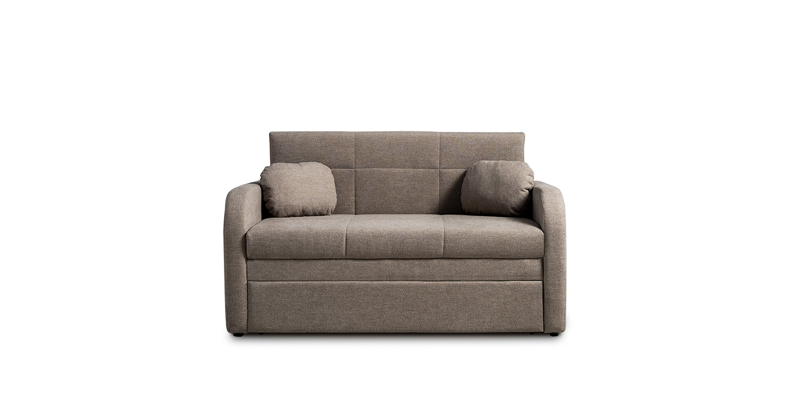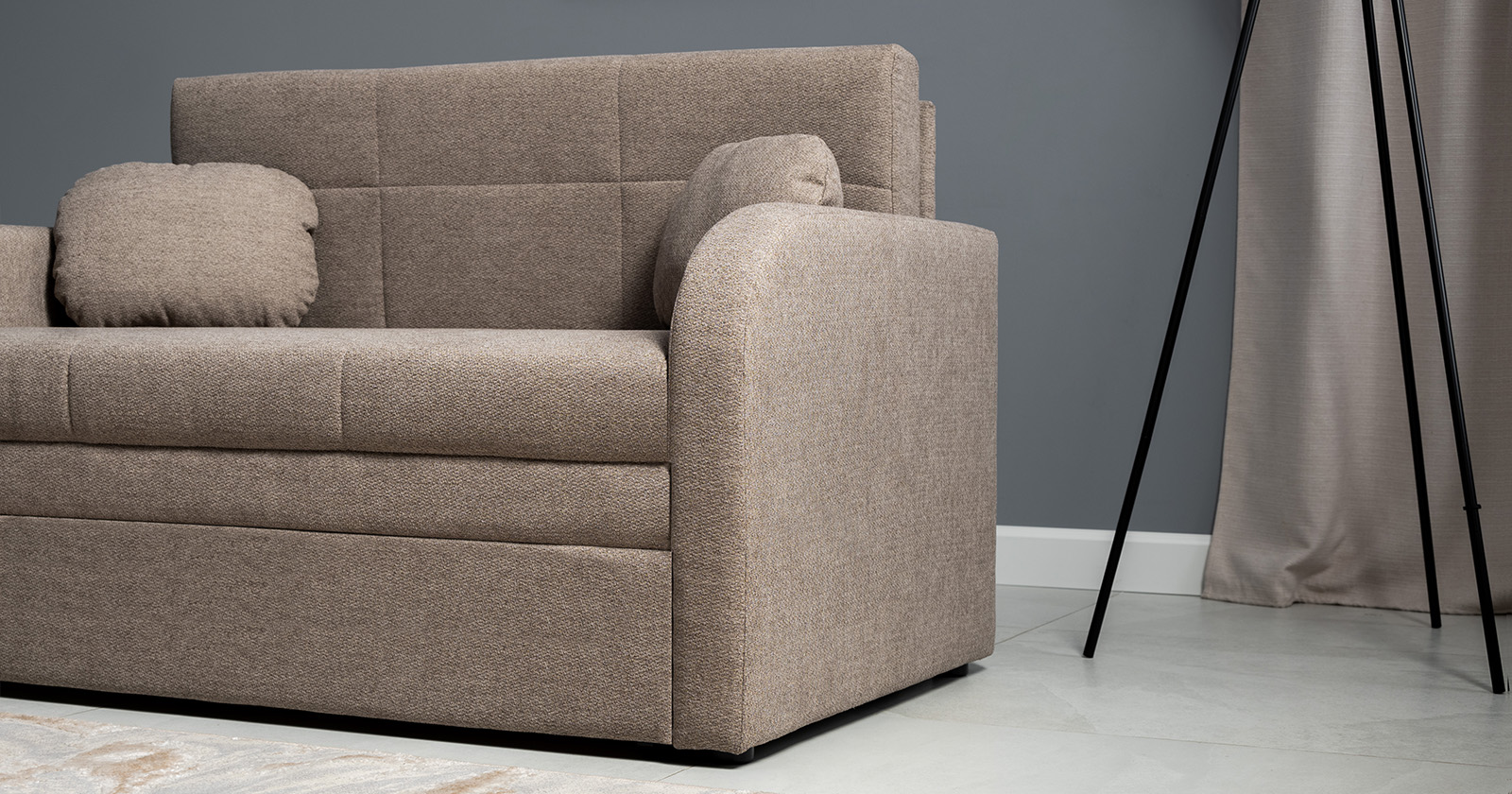 Коллекция выполнена в современном минималистичном стиле с мягкой обивкой из износостойкой ткани и декоративной стежкой, подчеркивающей геометрию форм. Механизм трансформации обеспечивает дополнительное спальное место, делая мебель не только эстетичной, но и максимально функциональной для небольших пространств.