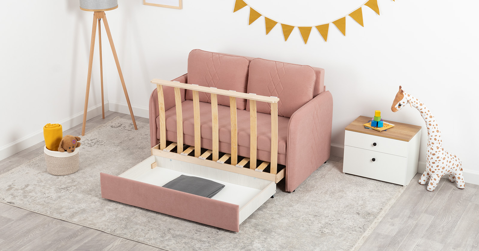 Стильный компактный диван для детской и гостиной. При своих скромных размерах он трансформируется в полноценное спальное место для детей и подростков. Лаконичный дизайн в виде декоративной стежки подчеркивает фактуру велюра, а небольшие размеры позволят разместить его в любом пространстве.