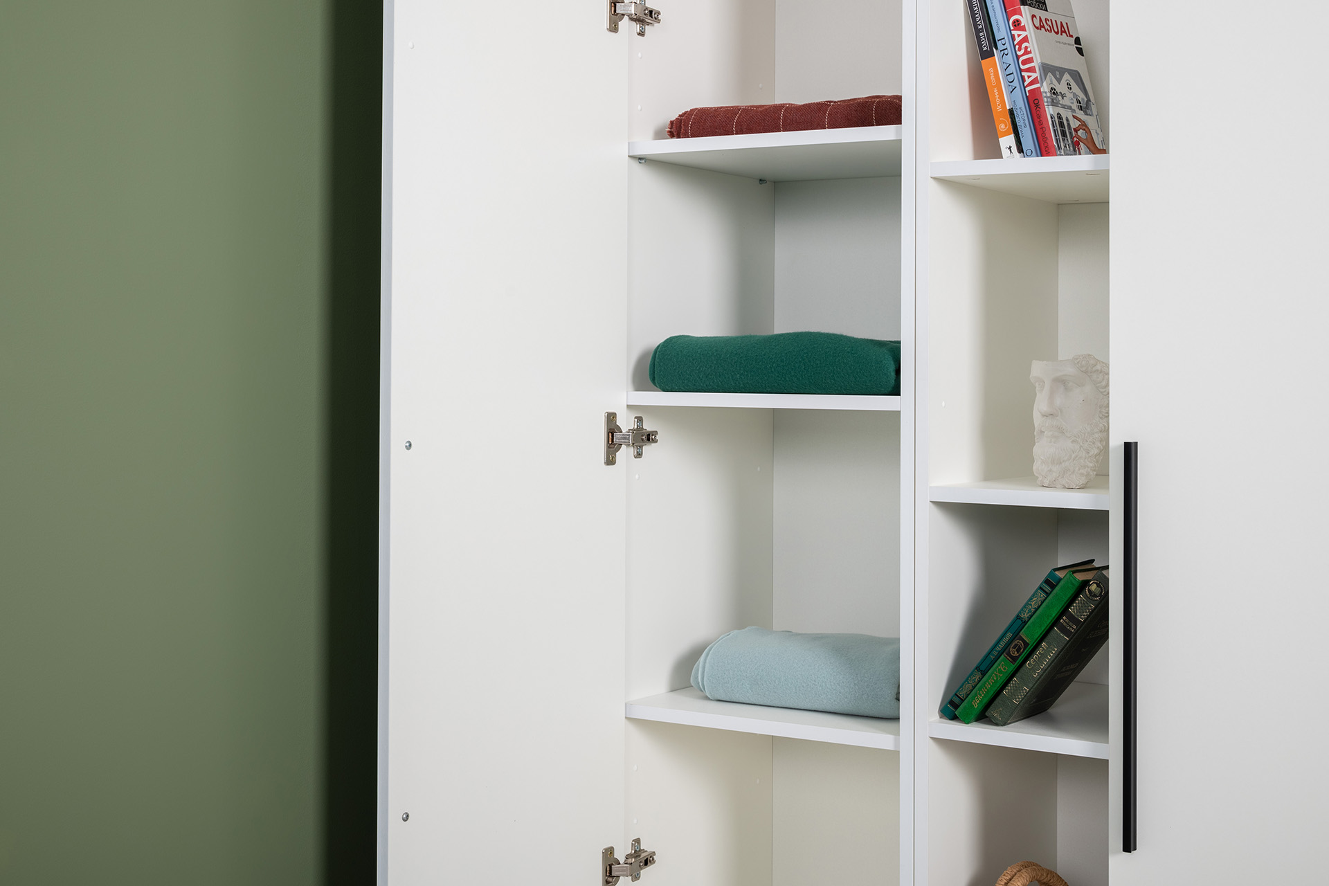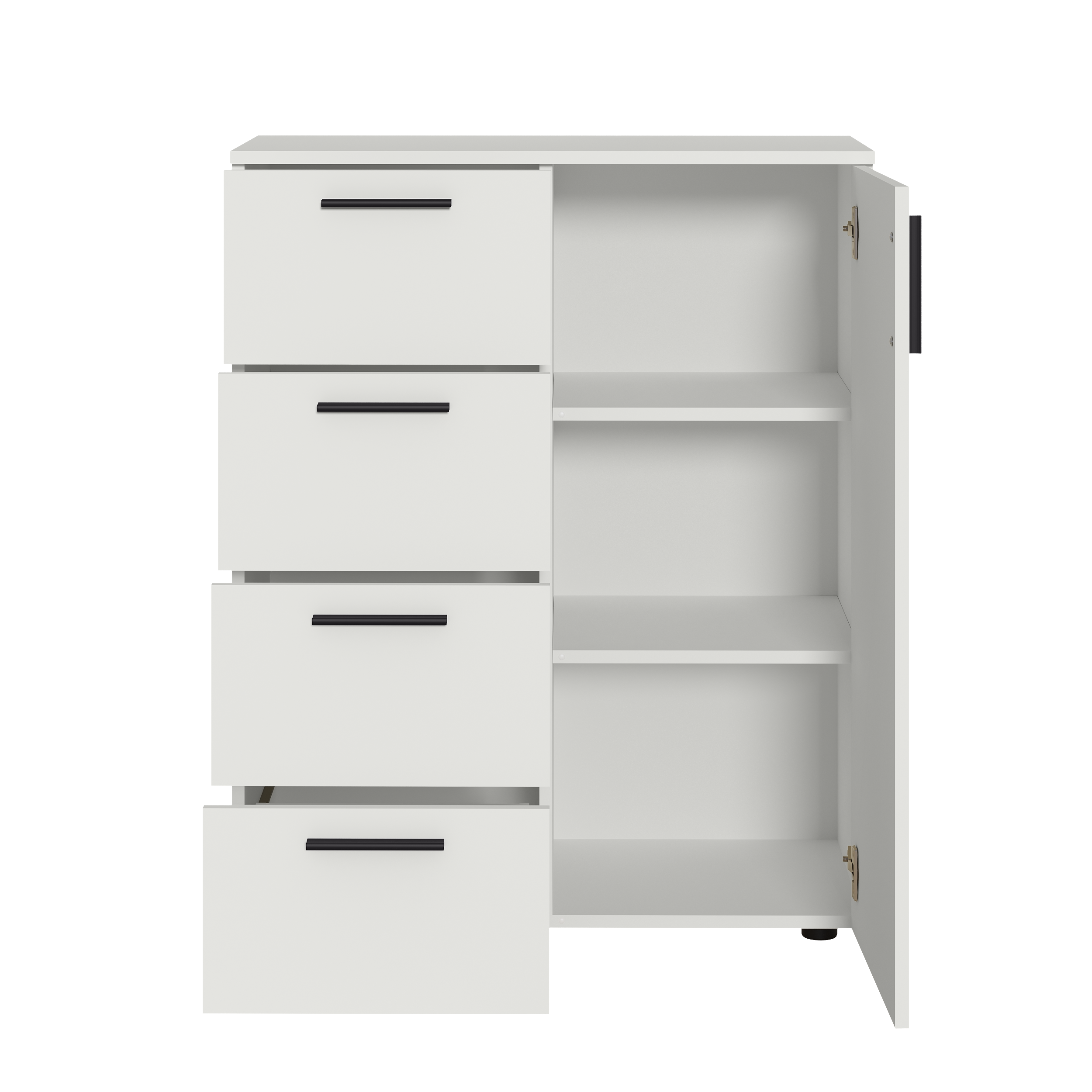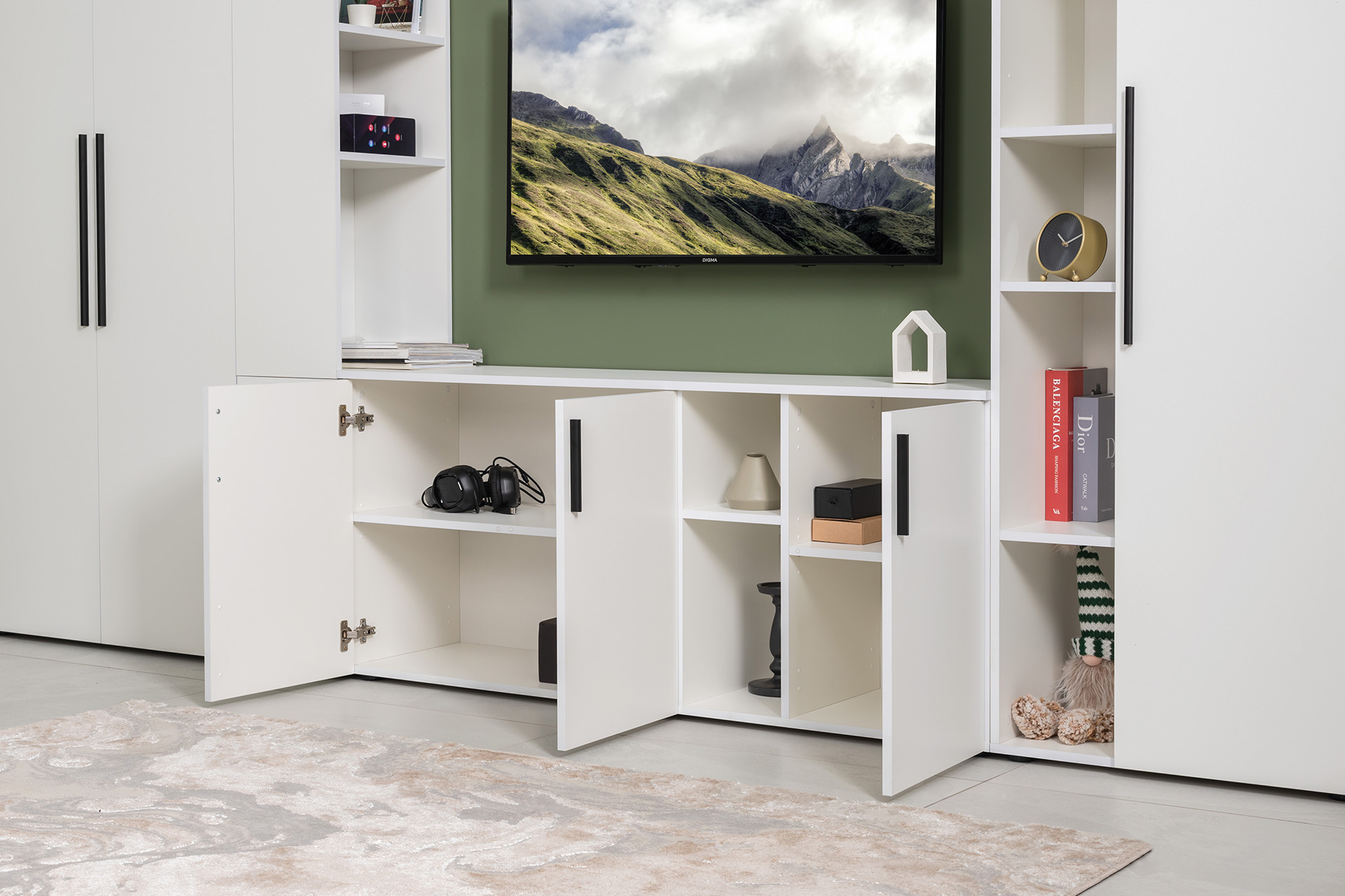 Модули универсальны и сочетаются между собой. Открытые и закрытые ниши для хранения, защитные пластиковые демпферы, съемные полки, направляющие полного выдвижения в ящиках – комфорт продуман до мелочей.