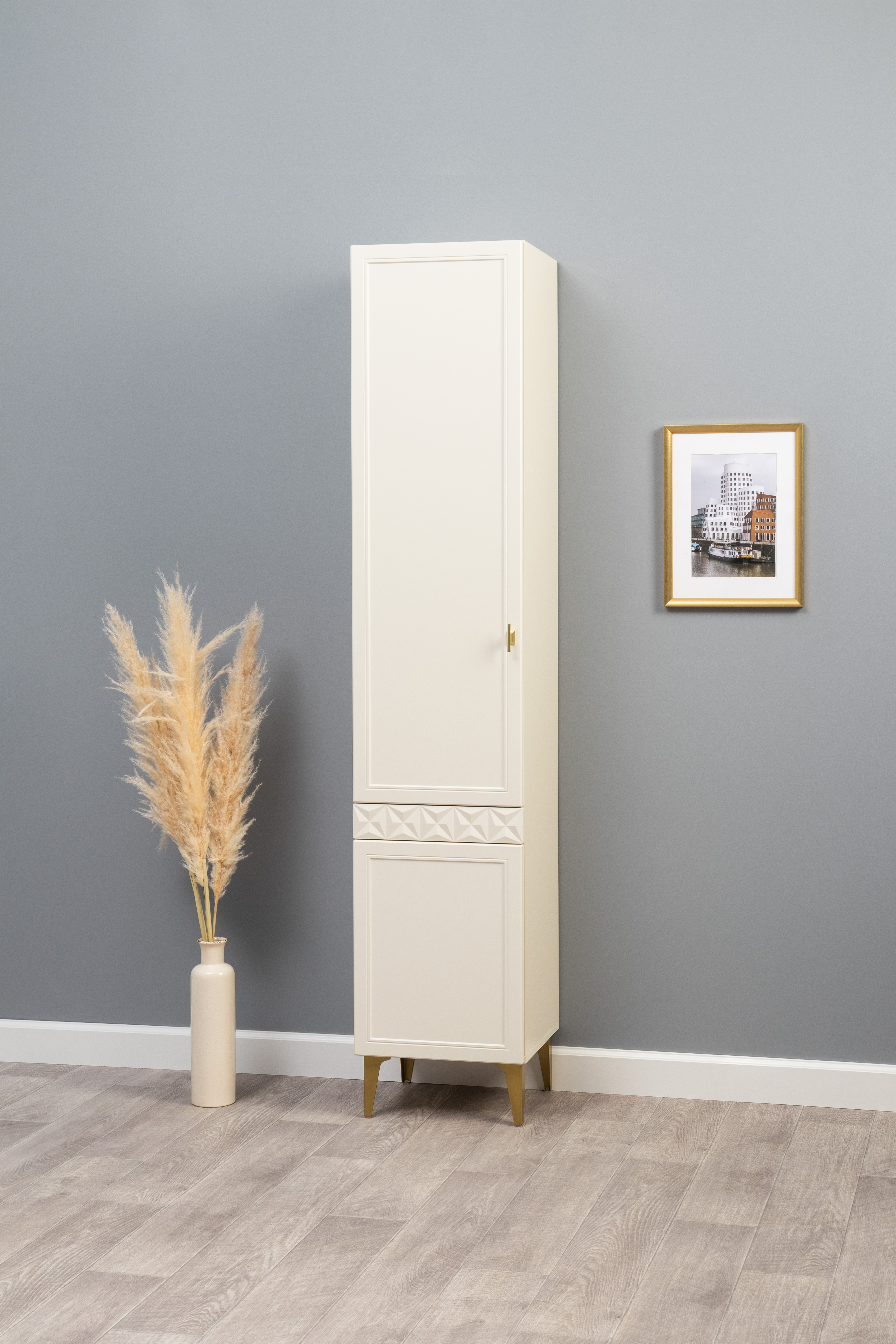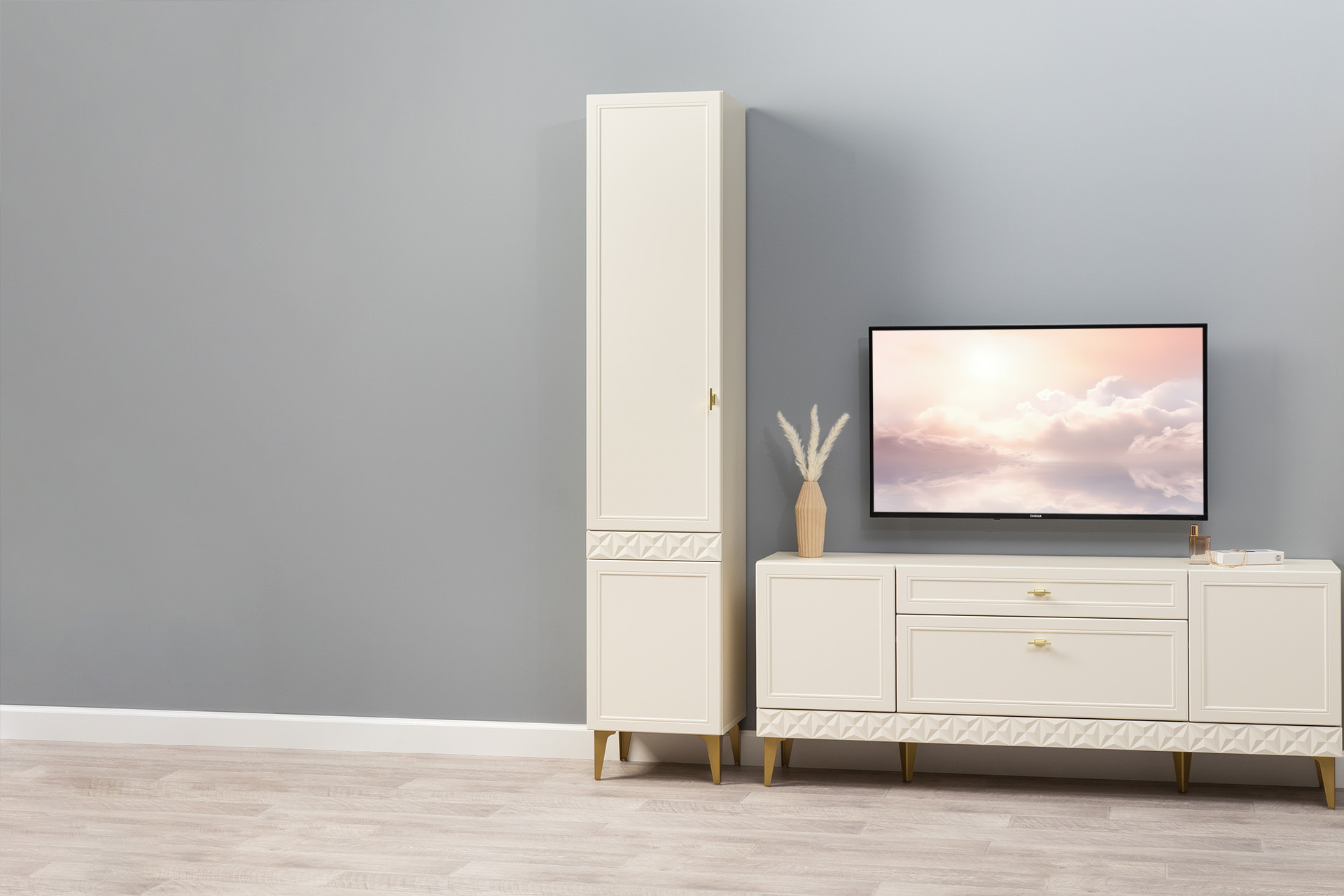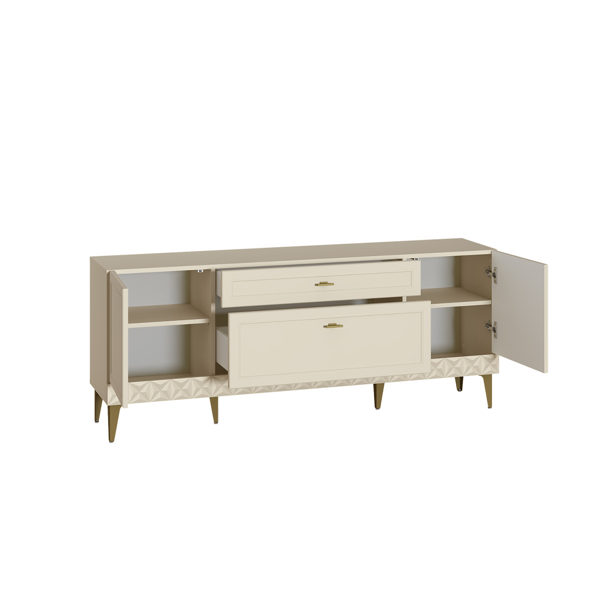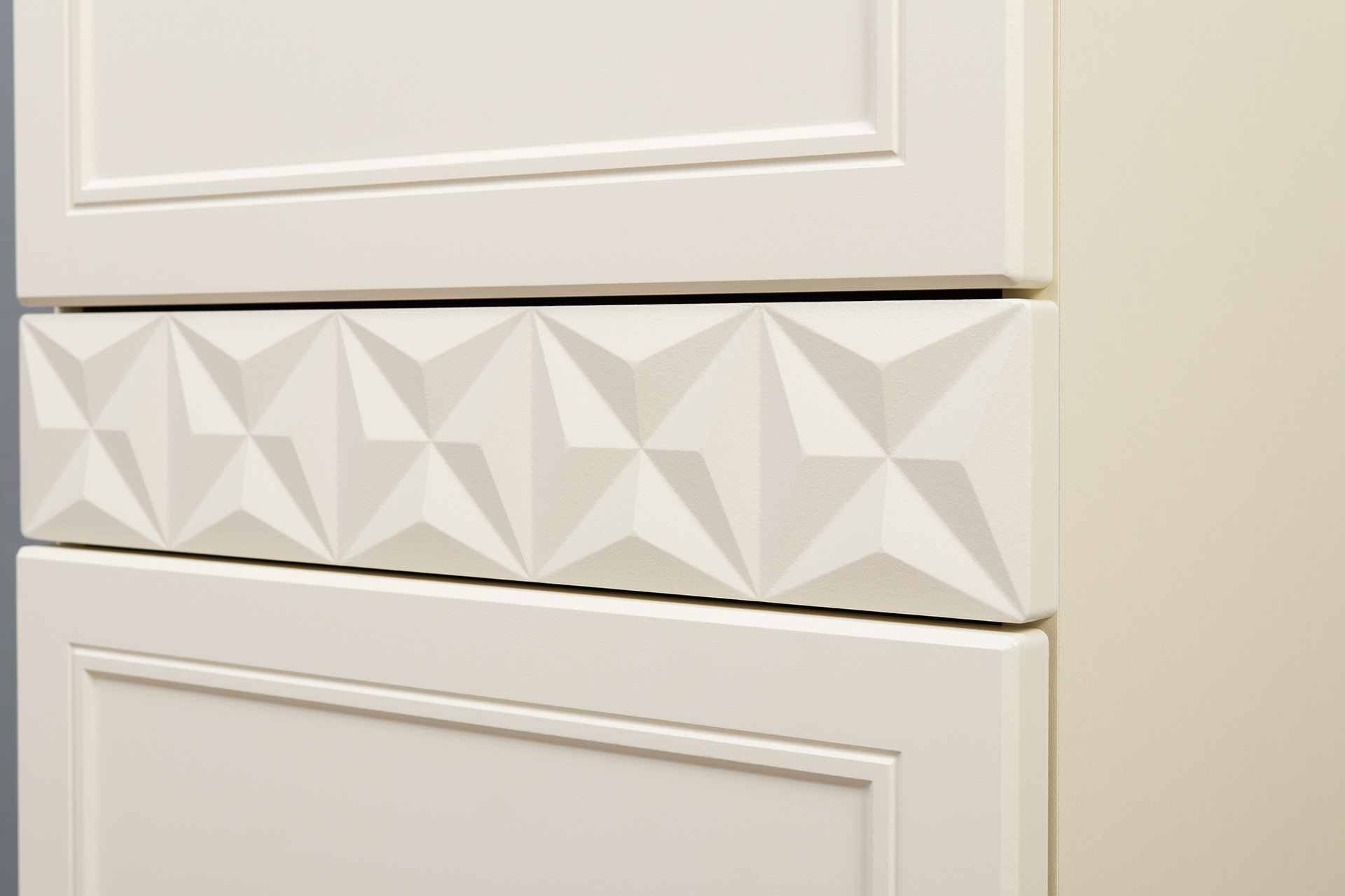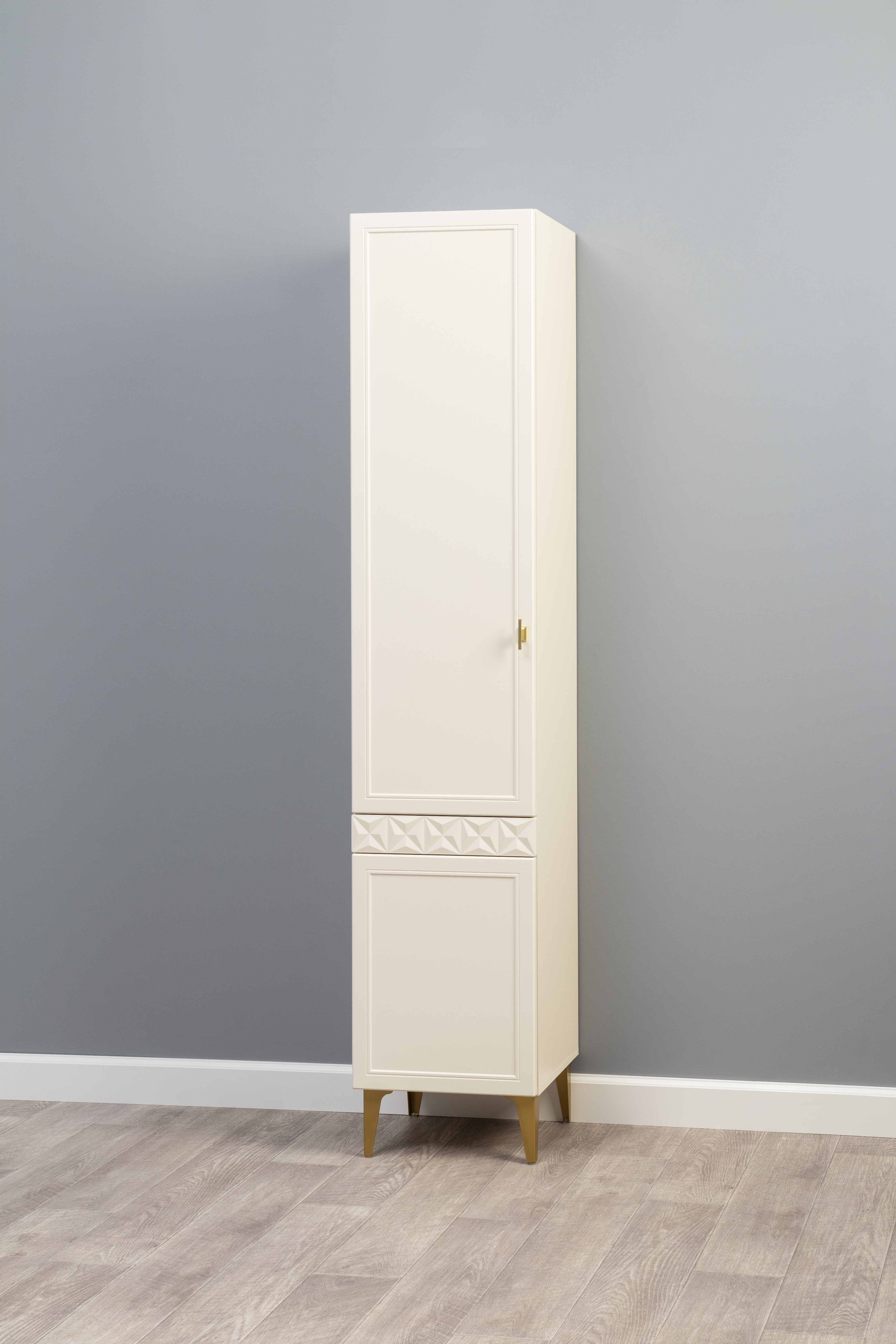 Изящные линии, глубокая фрезеровка фасадов из МДФ и благородные оттенки. Утончённая «Слоновая кость» и изысканная «Олива Шагрень» с глубоким зелёным тоном — создают атмосферу уюта, тепла и благородства. Металлические ручки и опоры золотого цвета придают мебели утончённый блеск, а петли и направляющие с доводчиками обеспечивают плавное и бесшумное закрытие фасадов.