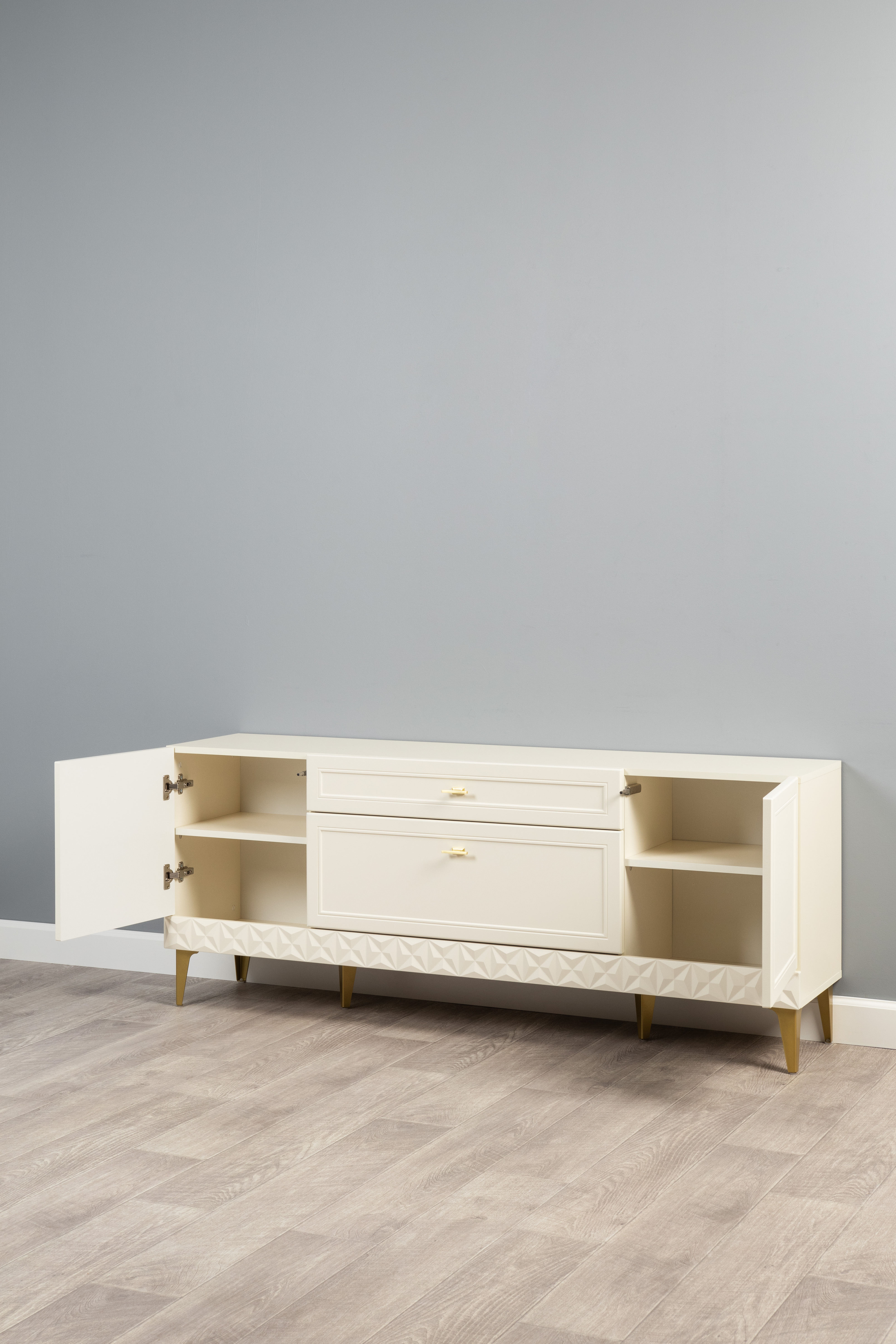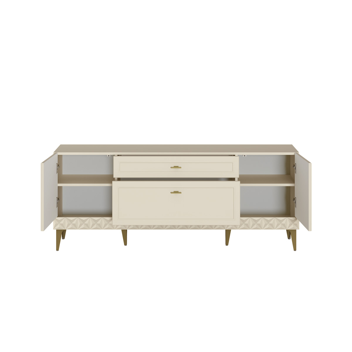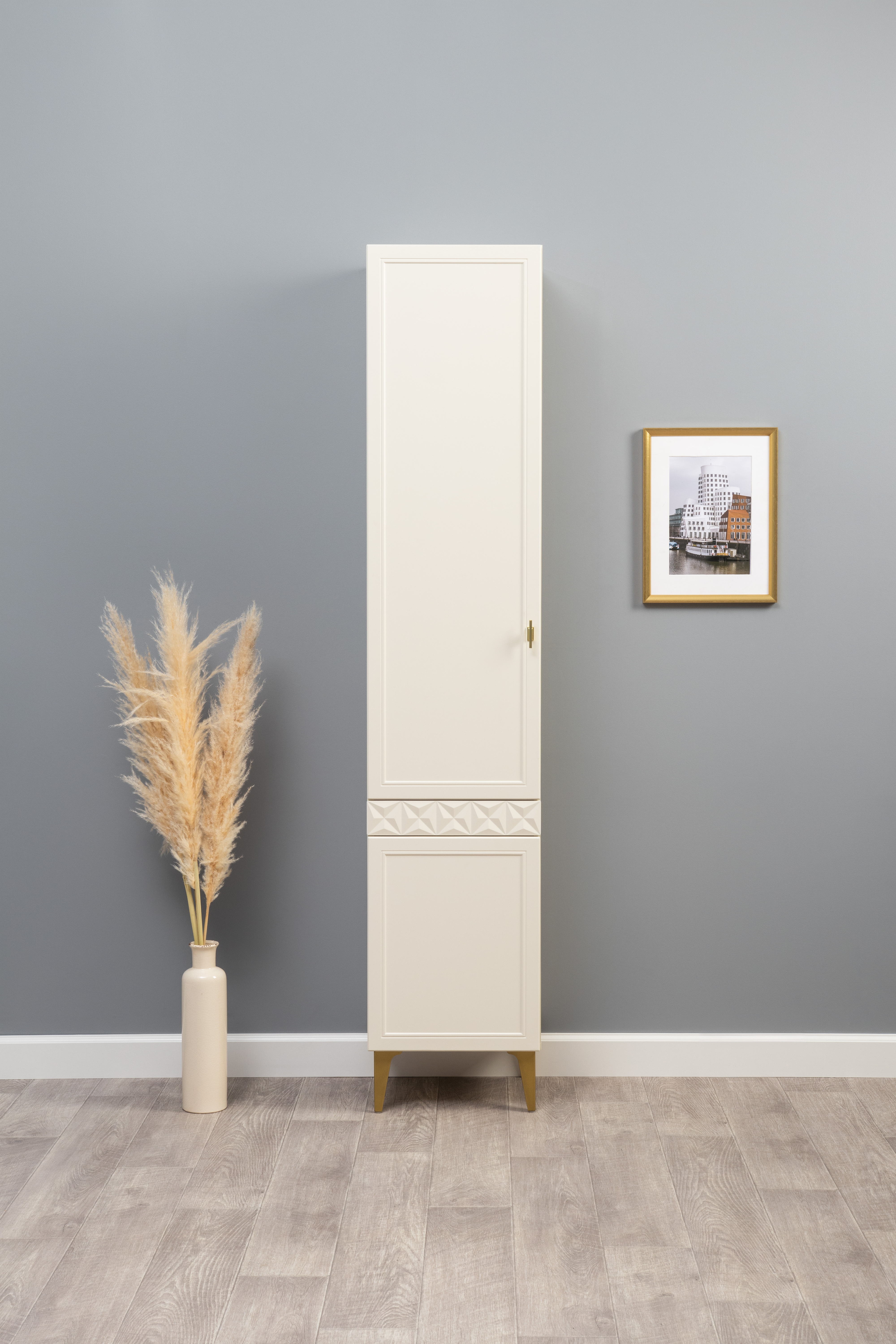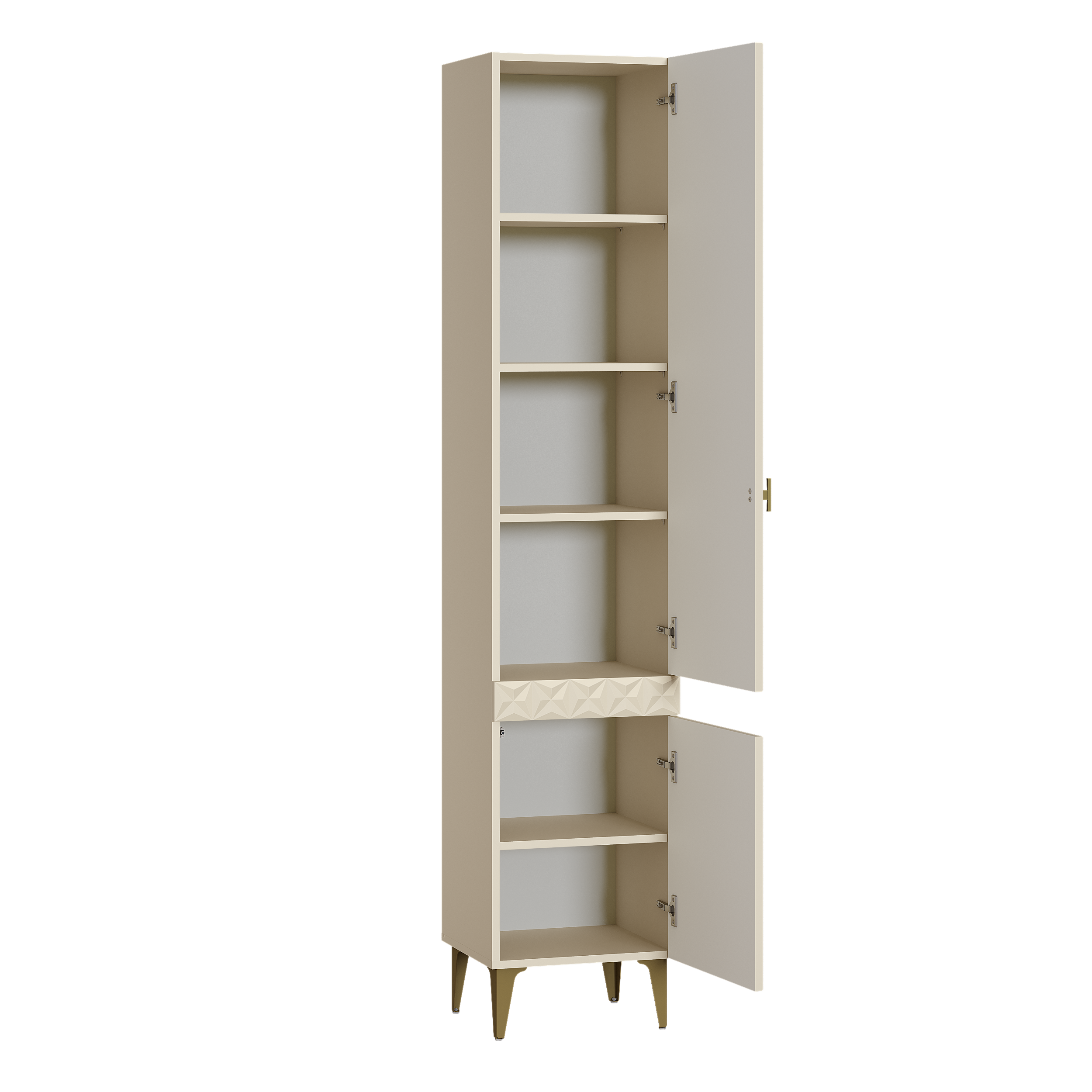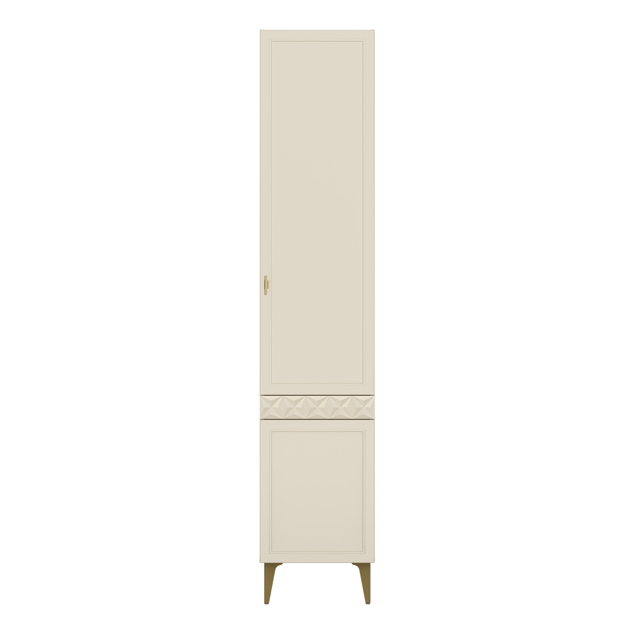 Изящные линии, глубокая фрезеровка фасадов из МДФ и благородные оттенки. Утончённая «Слоновая кость» и изысканная «Олива Шагрень» с глубоким зелёным тоном — создают атмосферу уюта, тепла и благородства. Металлические ручки и опоры золотого цвета придают мебели утончённый блеск, а петли и направляющие с доводчиками обеспечивают плавное и бесшумное закрытие фасадов.
