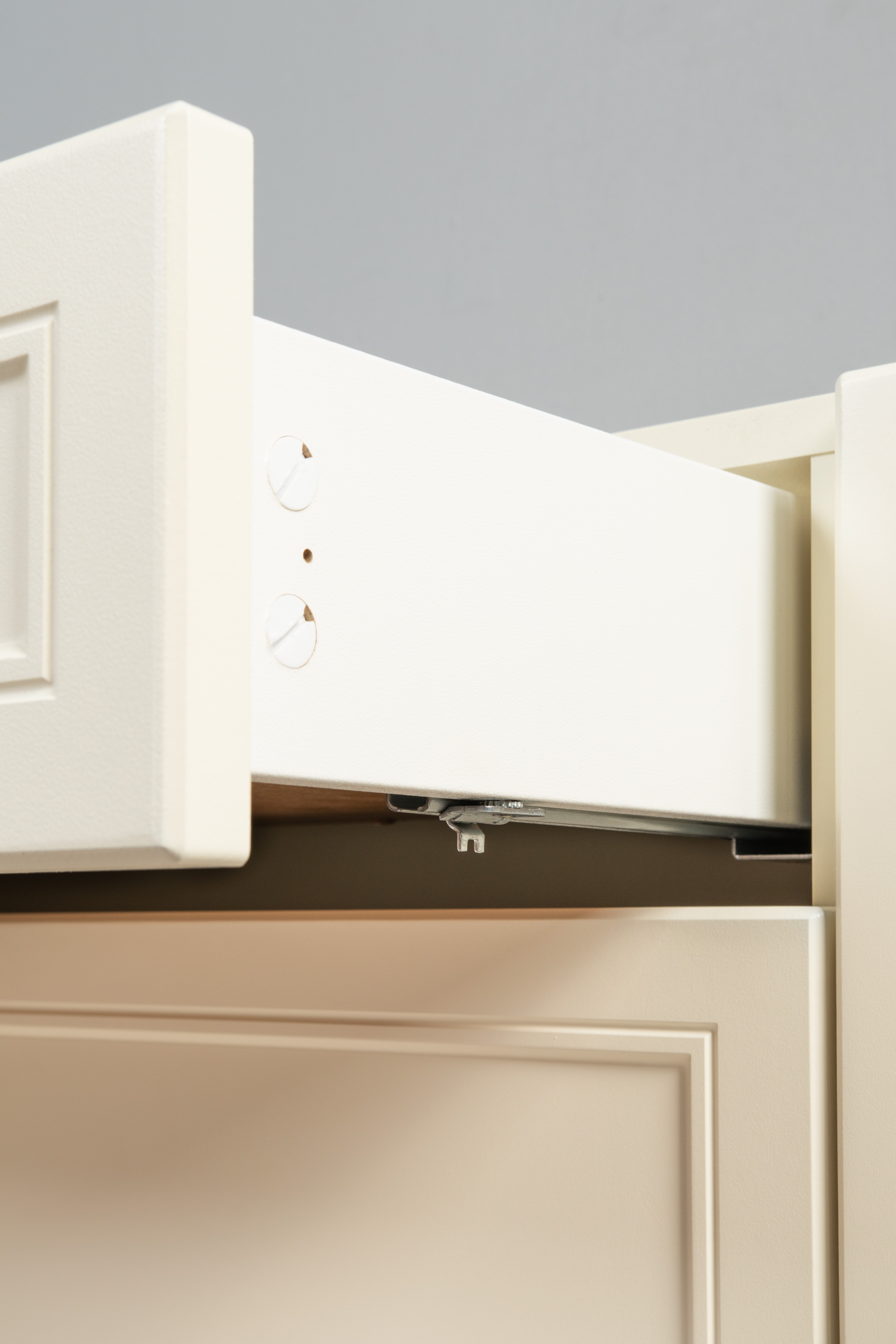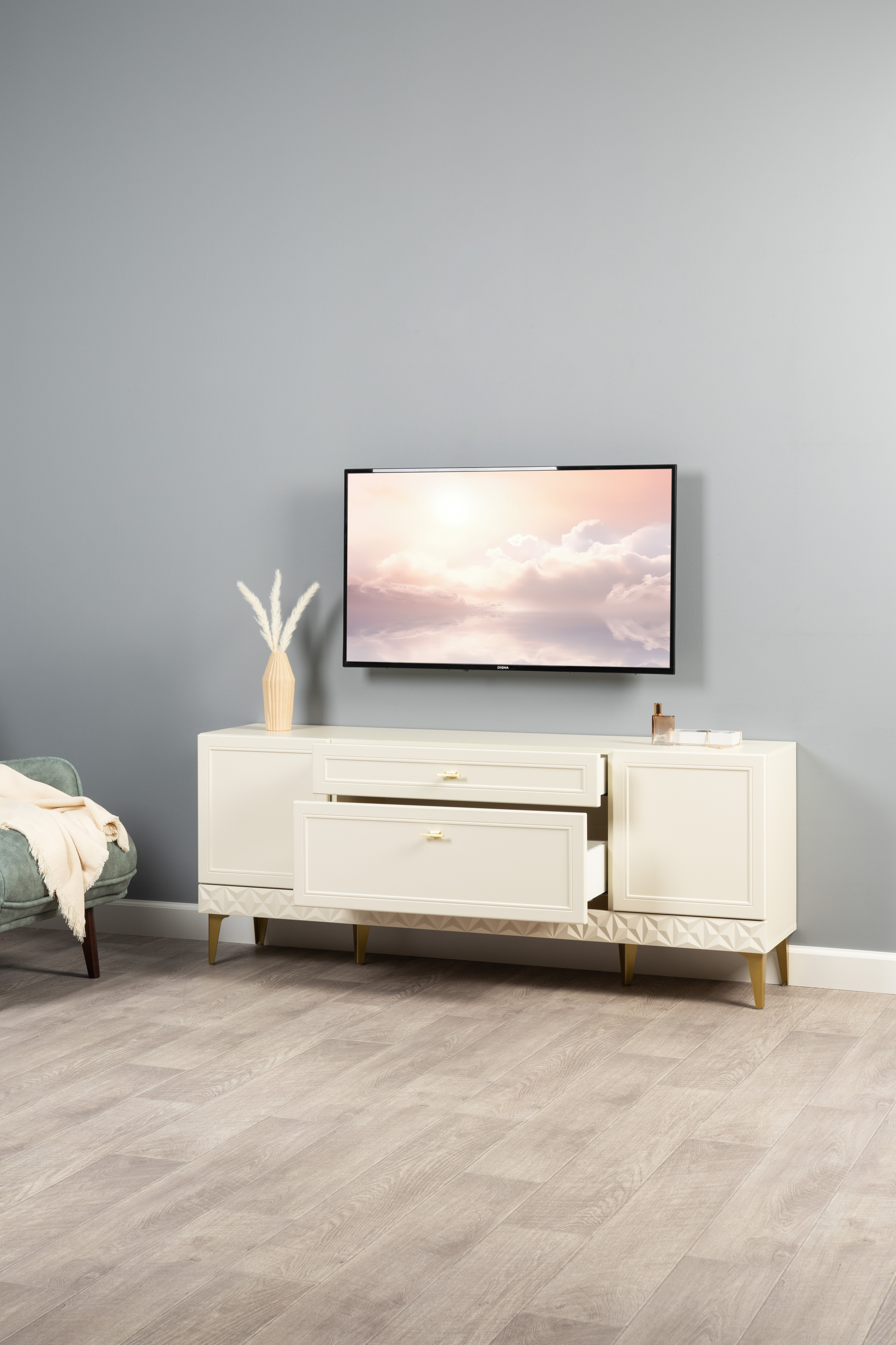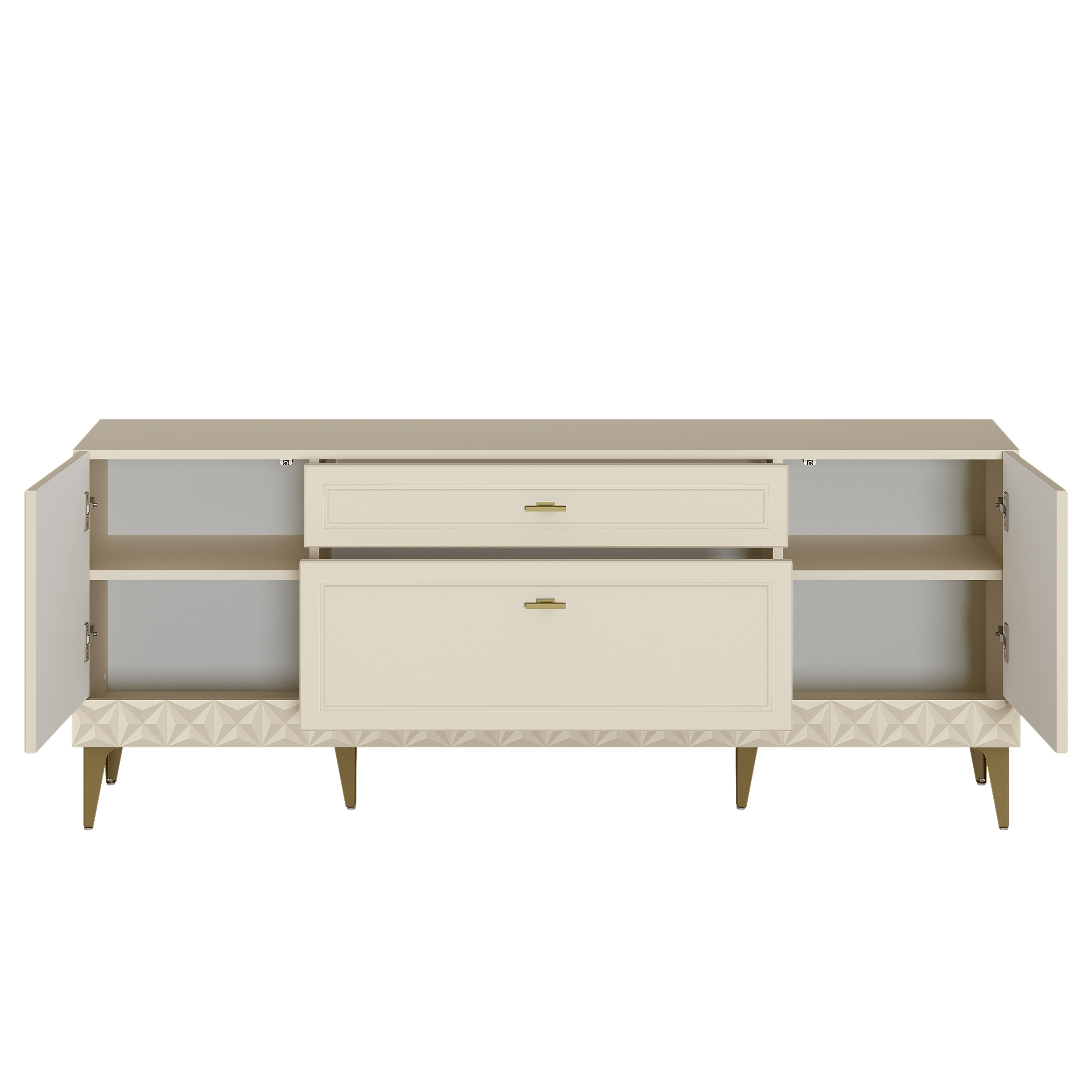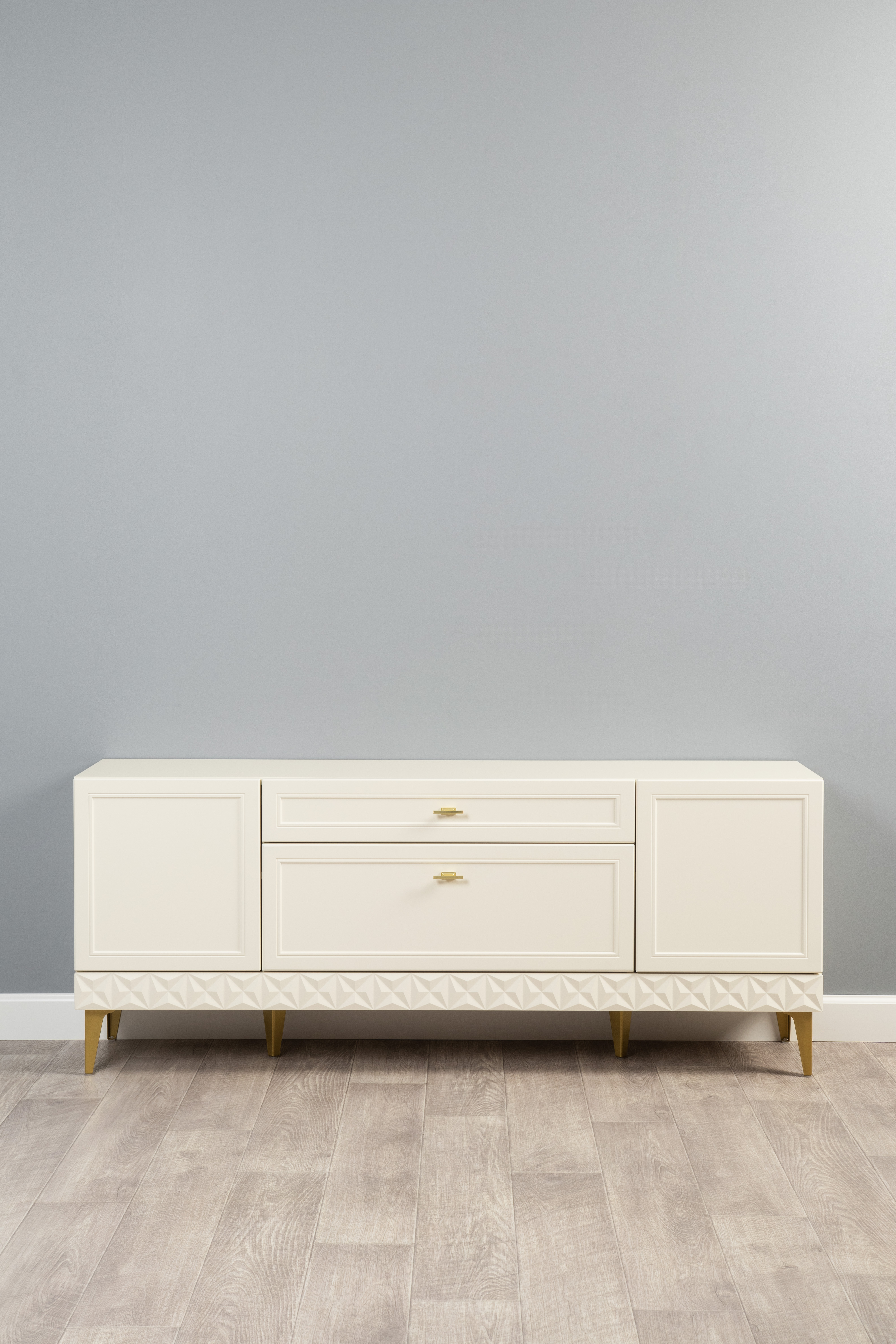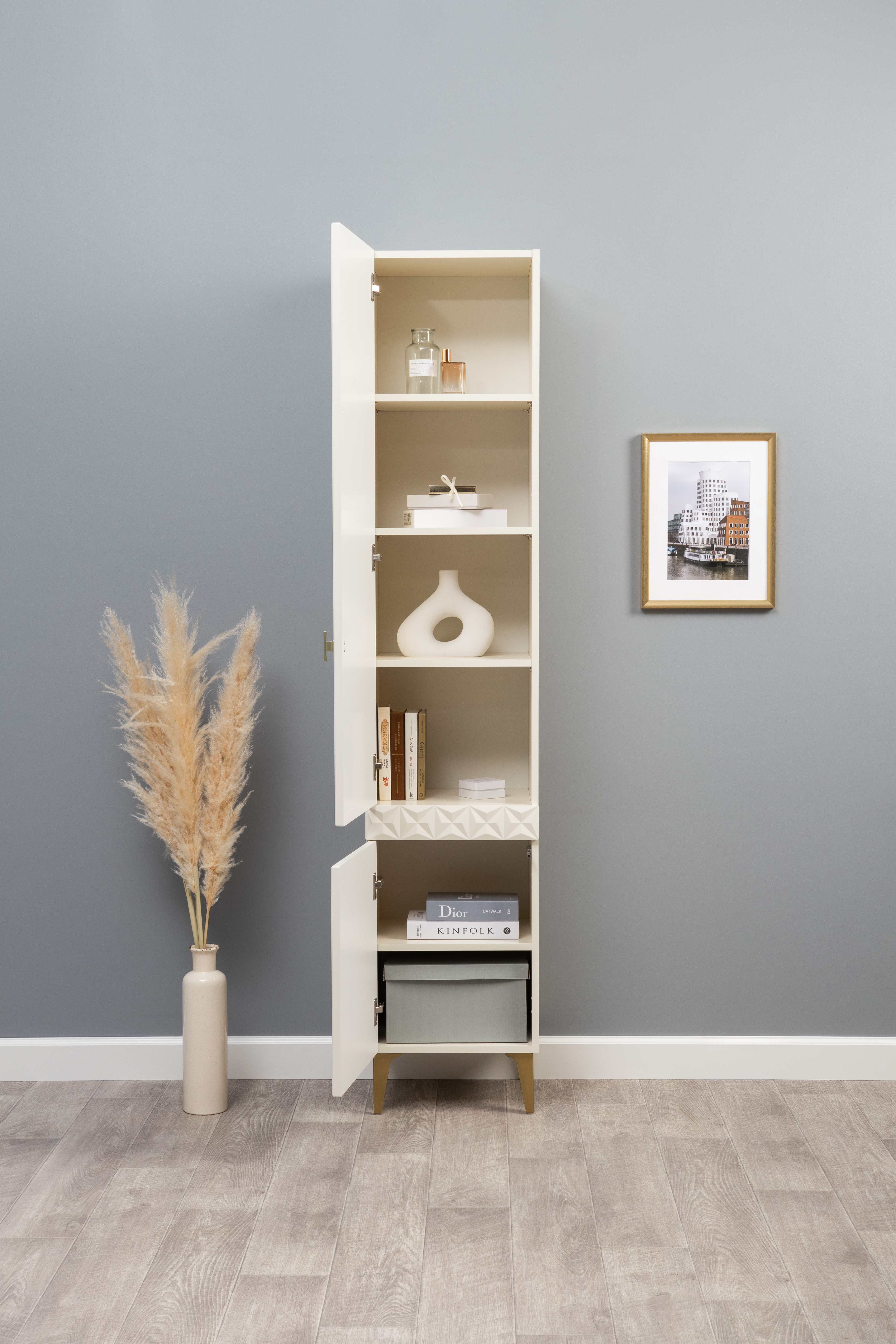 Изящные линии, глубокая фрезеровка фасадов из МДФ и благородные оттенки. Утончённая «Слоновая кость» и изысканная «Олива Шагрень» с глубоким зелёным тоном — создают атмосферу уюта, тепла и благородства. Металлические ручки и опоры золотого цвета придают мебели утончённый блеск, а петли и направляющие с доводчиками обеспечивают плавное и бесшумное закрытие фасадов.