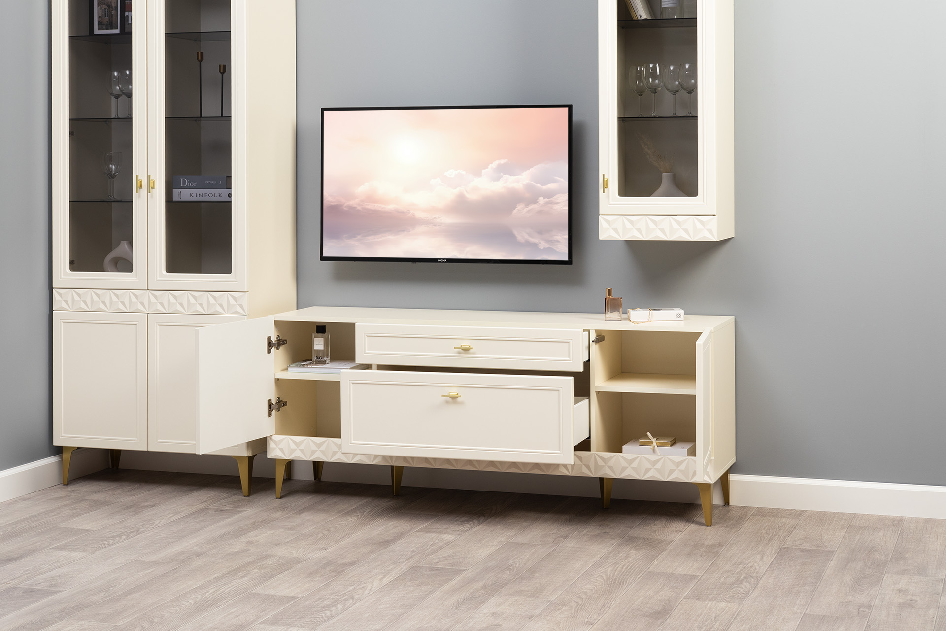 В коллекции представлены три типа витрин с тонированным закалённым стеклом, которые придают пространству лёгкость и свет. «Марион» — идеальное сочетание традиций и актуального дизайна в каждой детали.