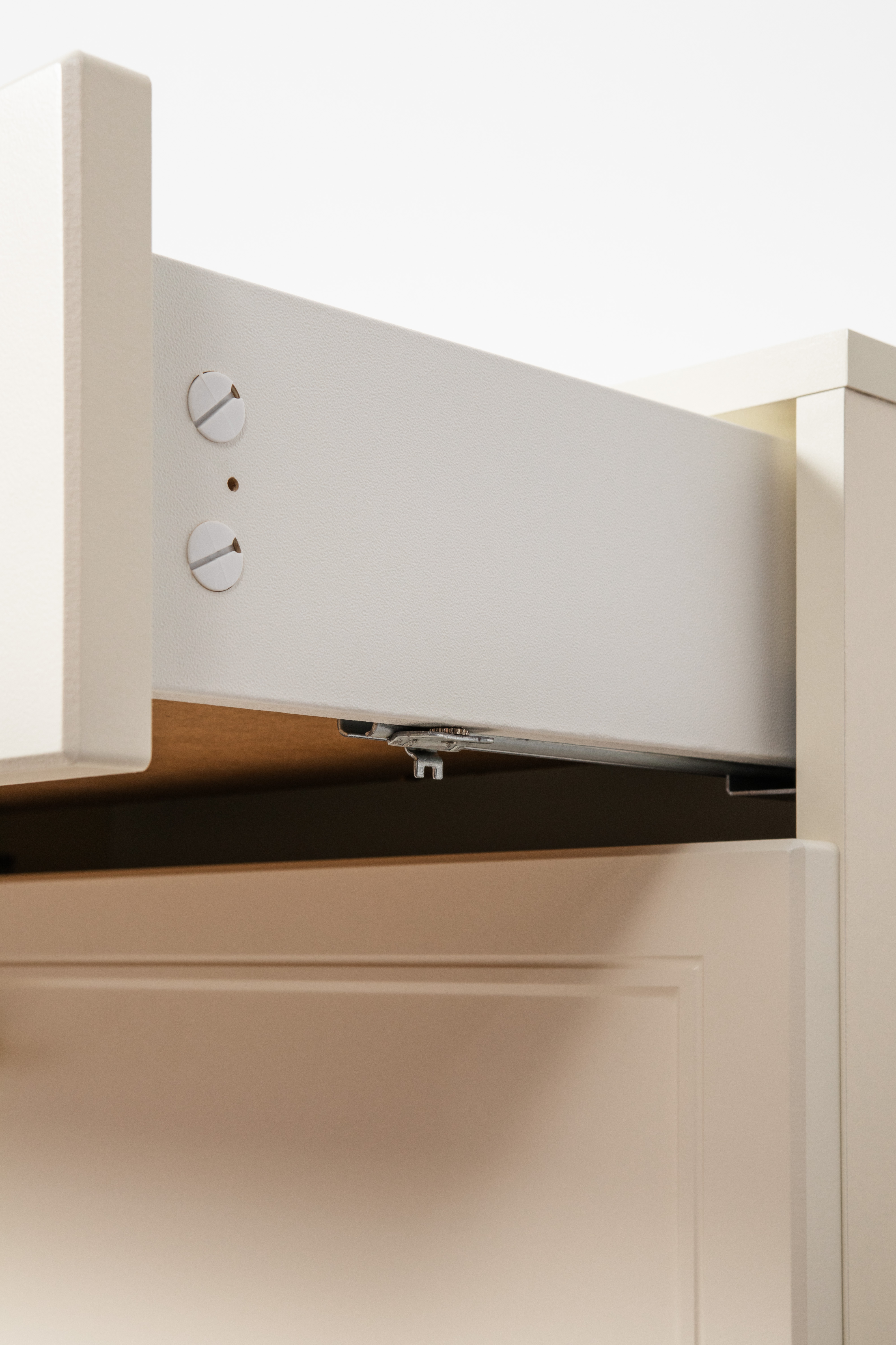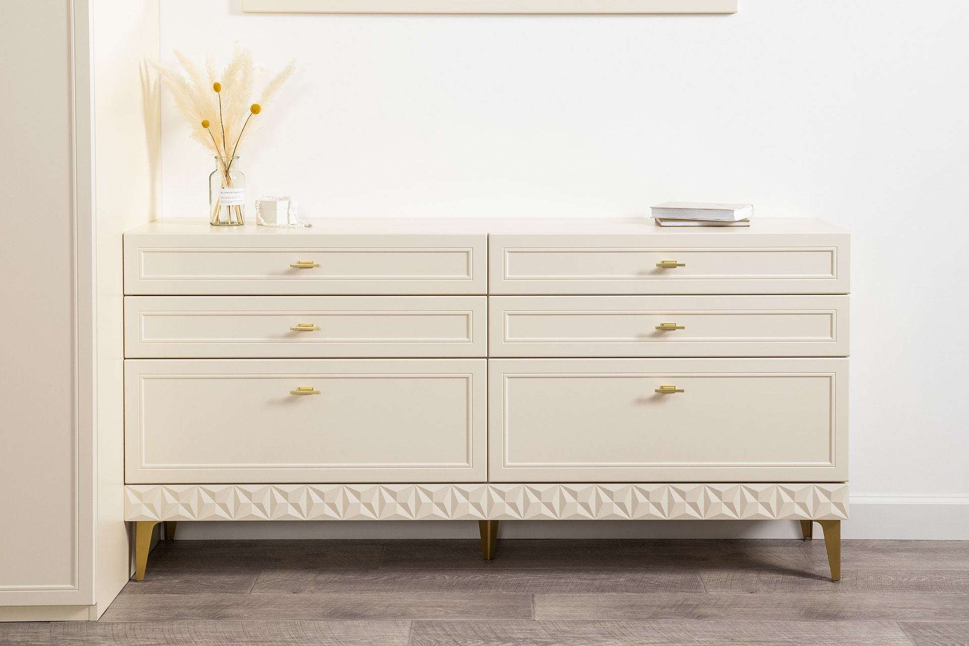 Изящные линии, глубокая фрезеровка фасадов из МДФ и благородные оттенки. Утончённая «Слоновая кость» и изысканная «Олива Шагрень» с глубоким зелёным тоном — создают атмосферу уюта, тепла и благородства. Металлические ручки и опоры золотого цвета придают мебели утончённый блеск, а петли и направляющие с доводчиками обеспечивают плавное и бесшумное закрытие фасадов.