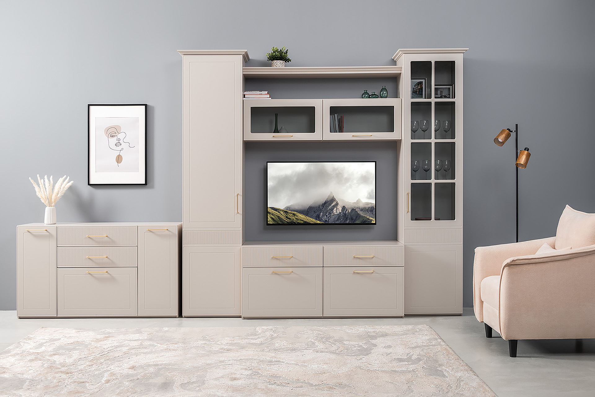Фрезерованные фасады из МДФ, металлические ручки и витрины с тонированным стеклом создают изысканный образ.