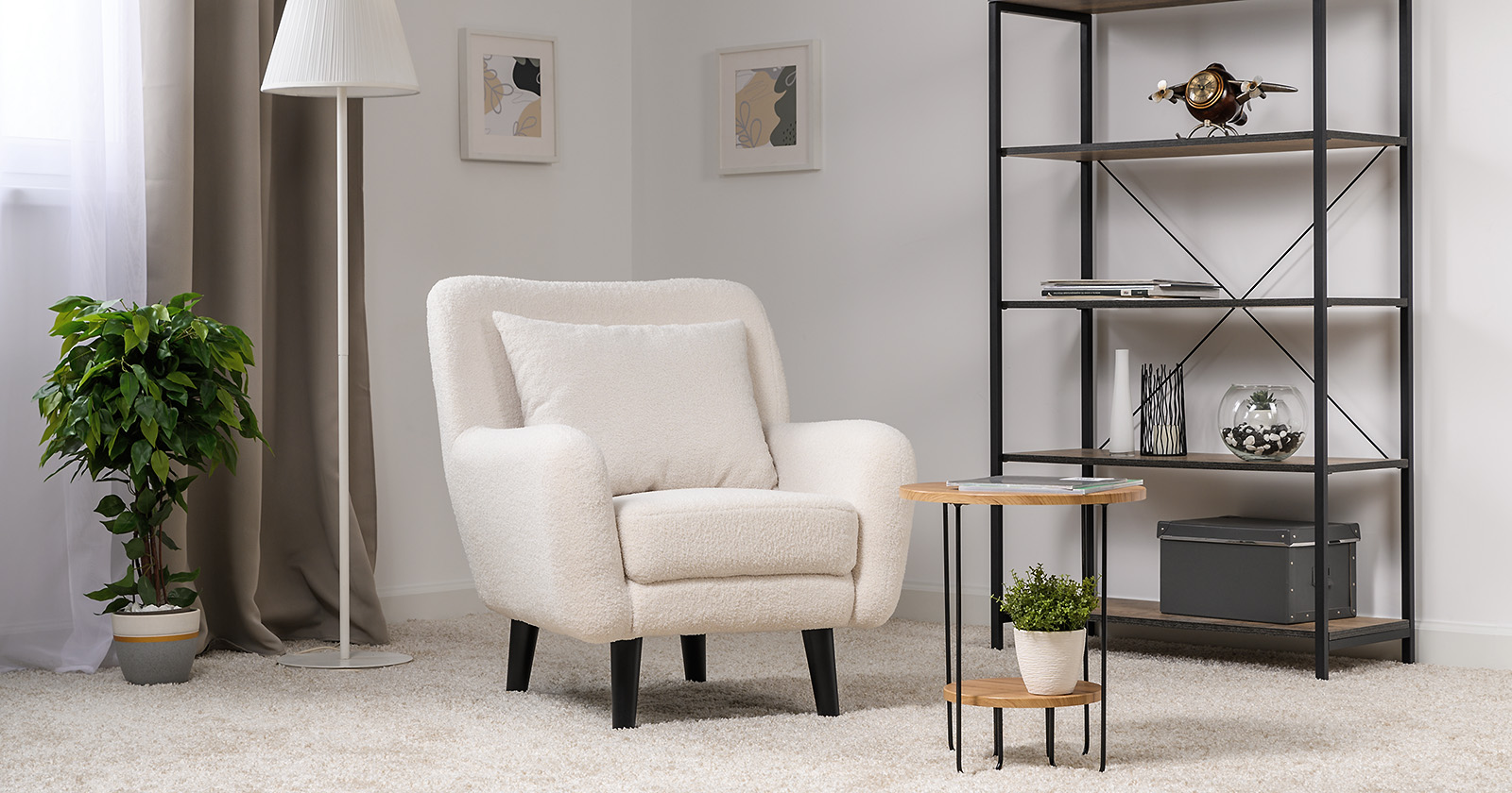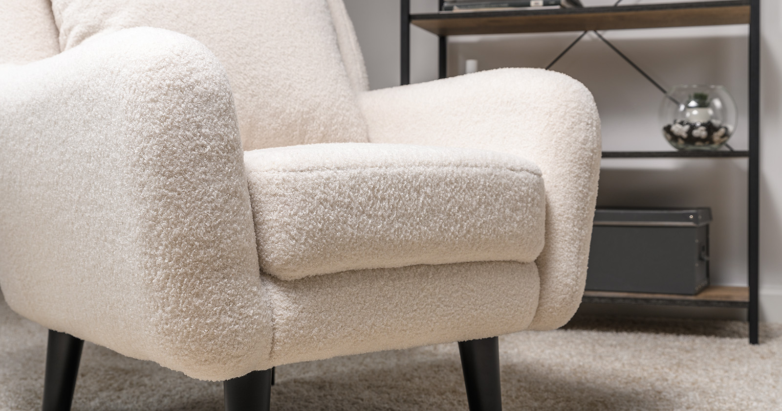 Ткань букле делает кресло особенно уютным и мягким. Приспинная подушка в цвете кресла