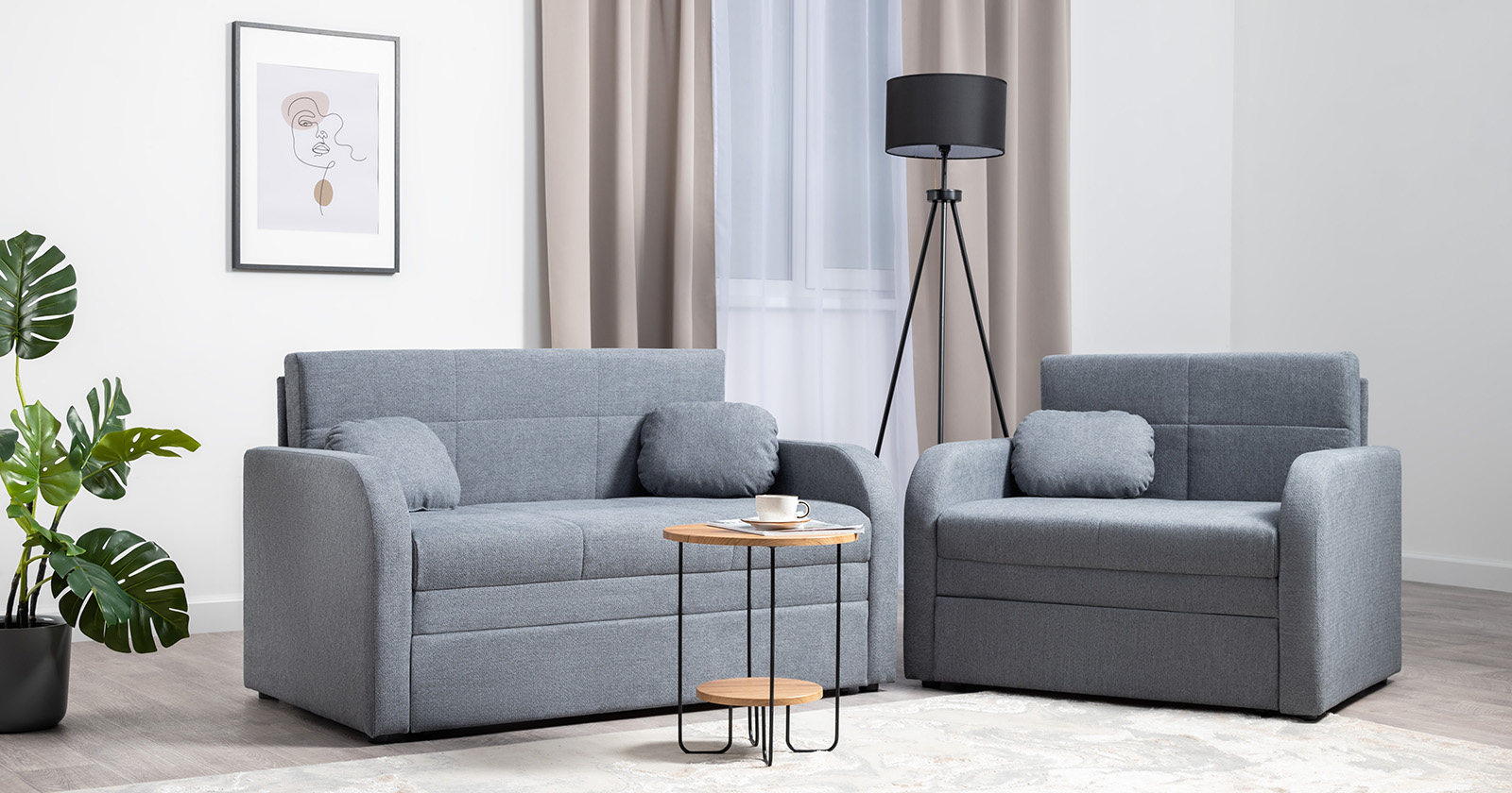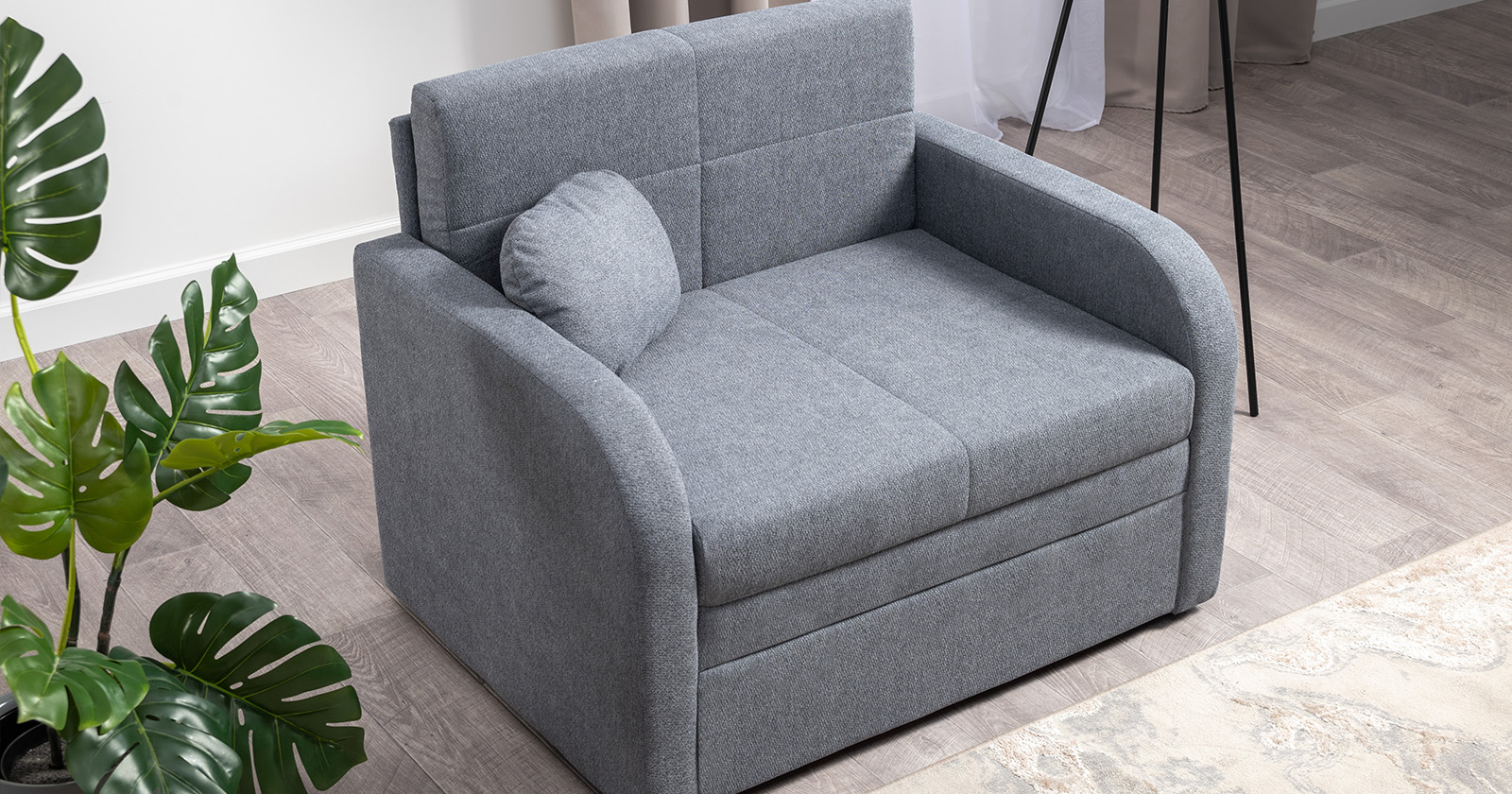 Коллекция выполнена в современном минималистичном стиле с мягкой обивкой из износостойкой ткани и декоративной стежкой, подчеркивающей геометрию форм. Механизм трансформации обеспечивает дополнительное спальное место, делая мебель не только эстетичной, но и максимально функциональной для небольших пространств.