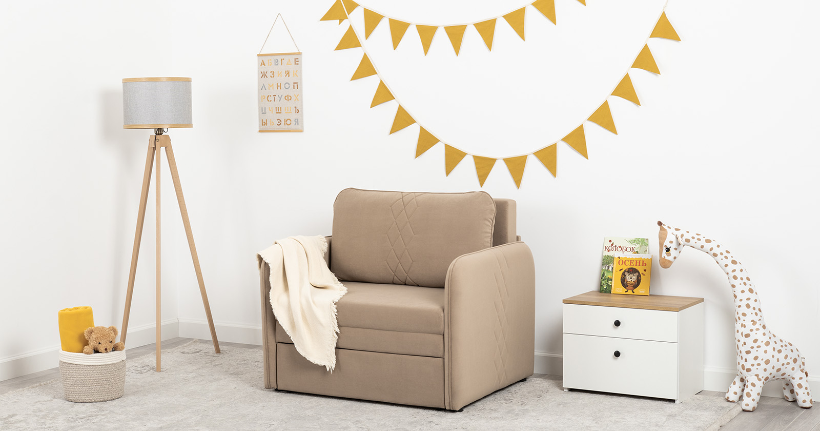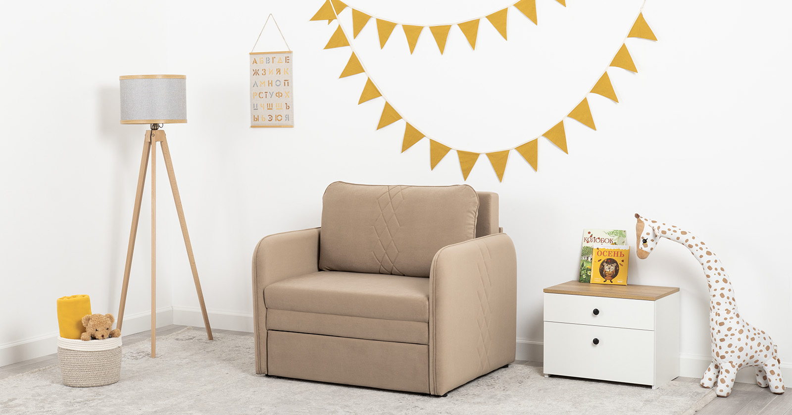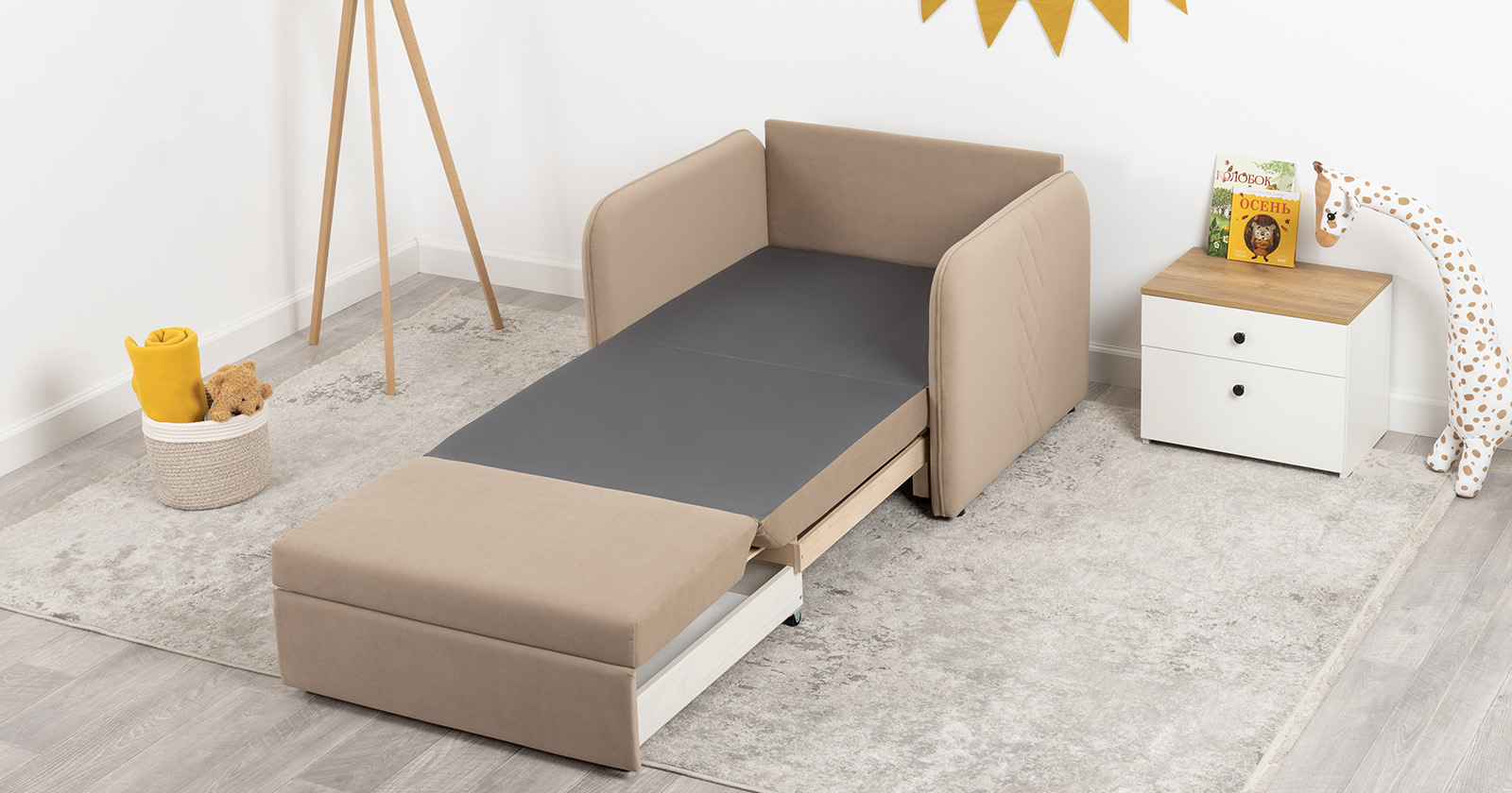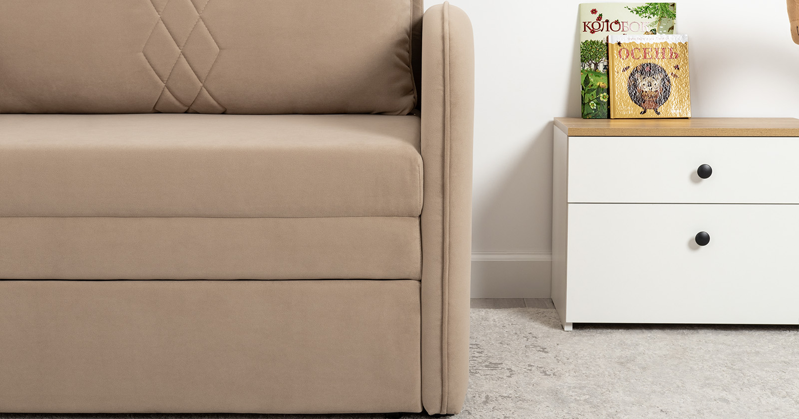 Стильный компактный диван для детской и гостиной. При своих скромных размерах он трансформируется в полноценное спальное место для детей и подростков. Лаконичный дизайн в виде декоративной стежки подчеркивает фактуру велюра, а небольшие размеры позволят разместить его в любом пространстве.