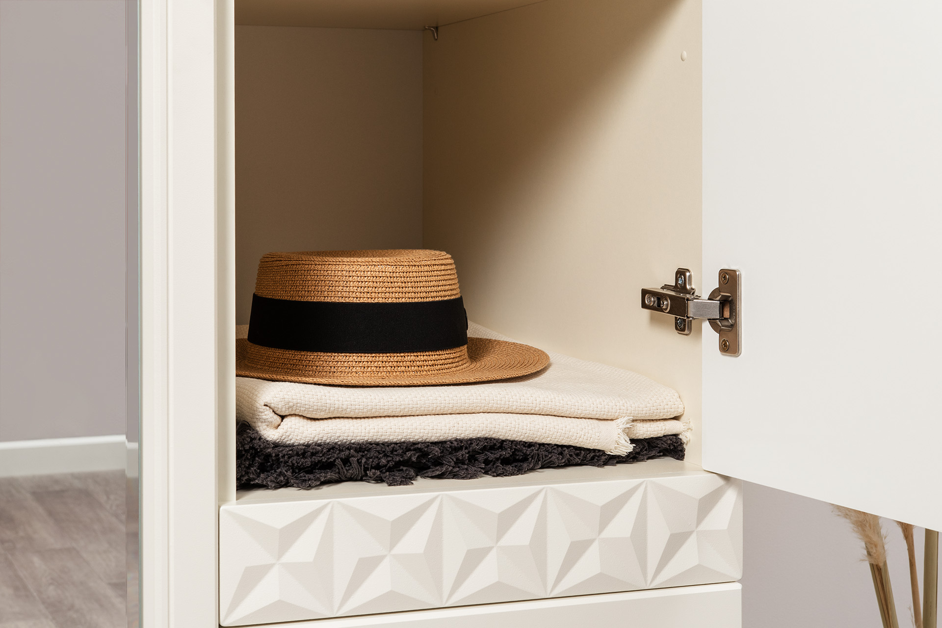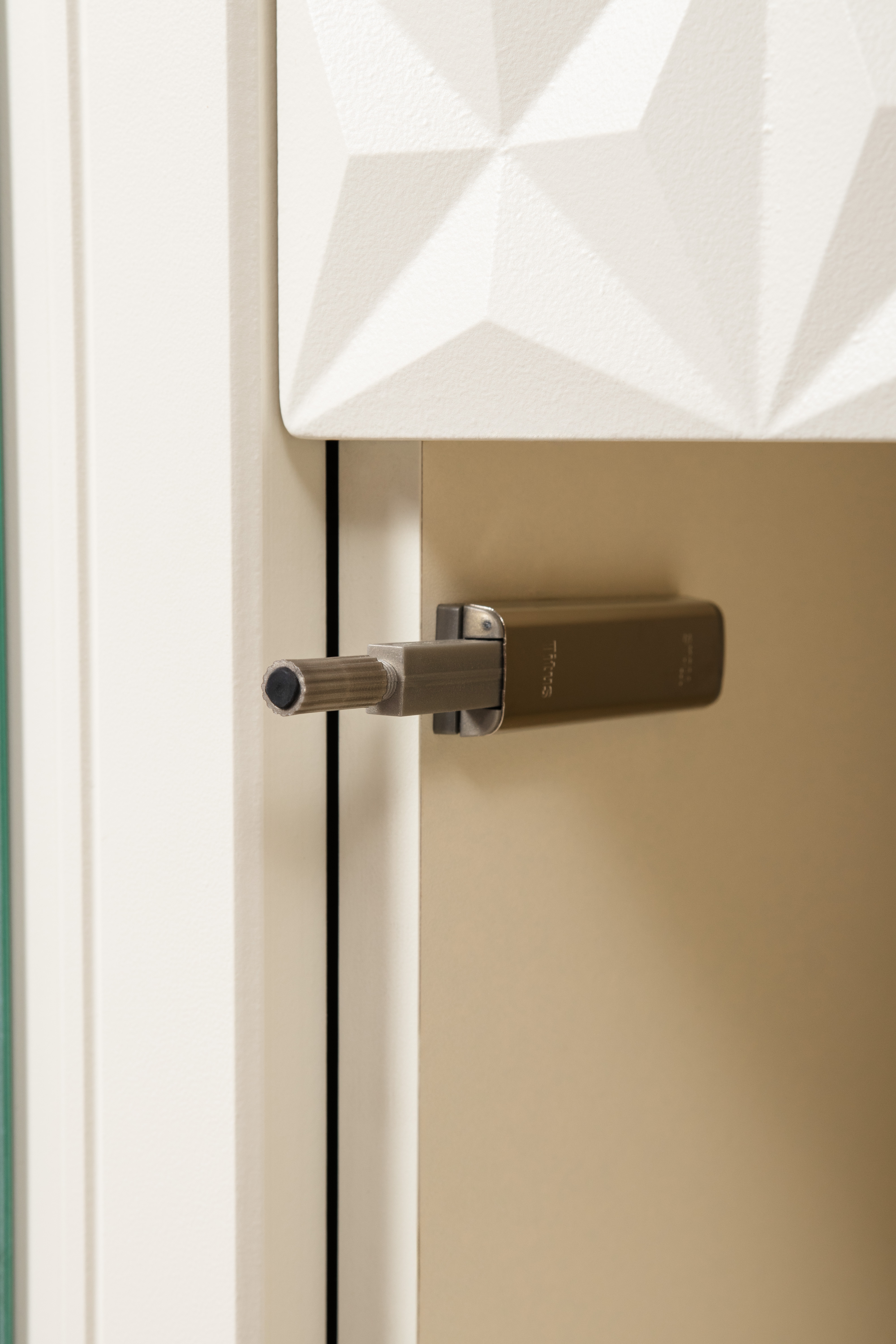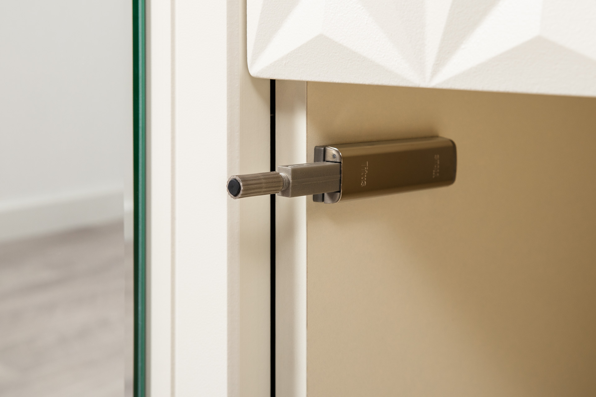 Изящные линии, глубокая фрезеровка фасадов из МДФ и благородные оттенки. Утончённая «Слоновая кость» и изысканная «Олива Шагрень» с глубоким зелёным тоном — создают атмосферу уюта, тепла и благородства. Металлические ручки и опоры золотого цвета придают мебели утончённый блеск, а петли и направляющие с доводчиками обеспечивают плавное и бесшумное закрытие фасадов.