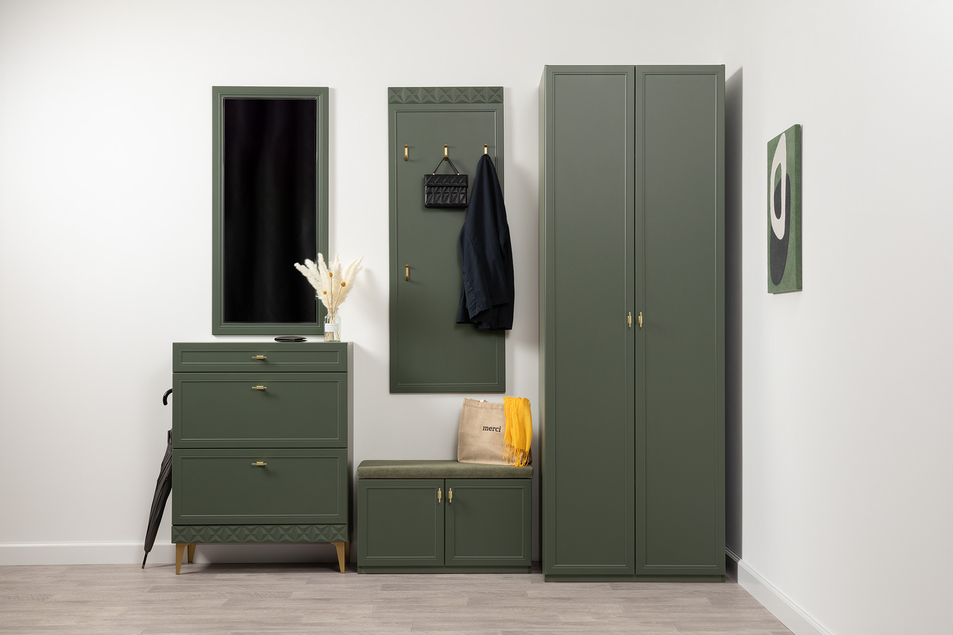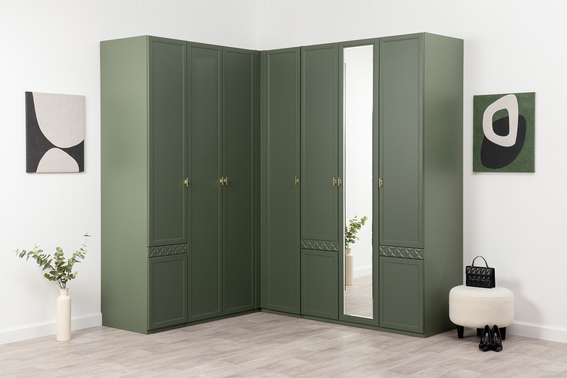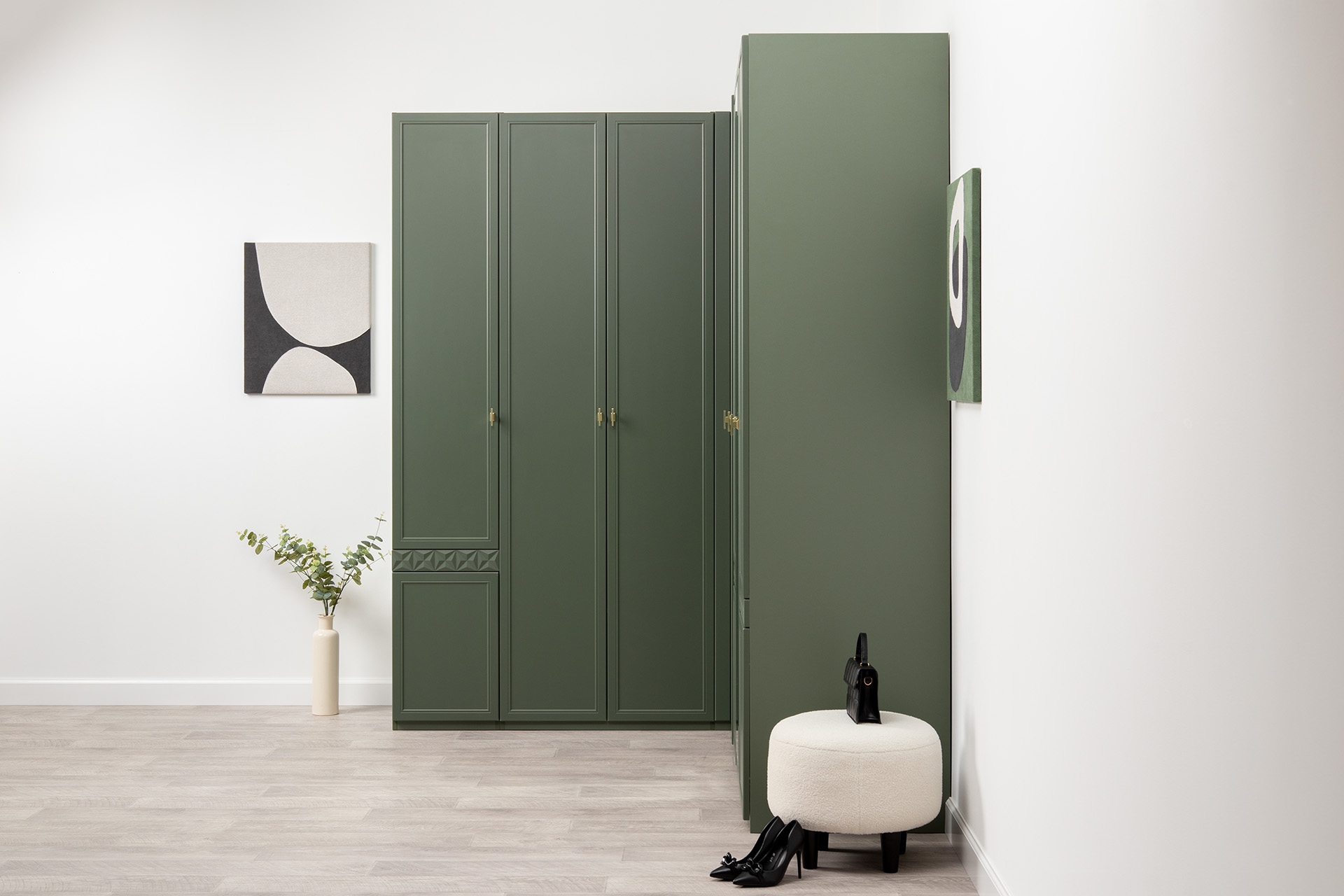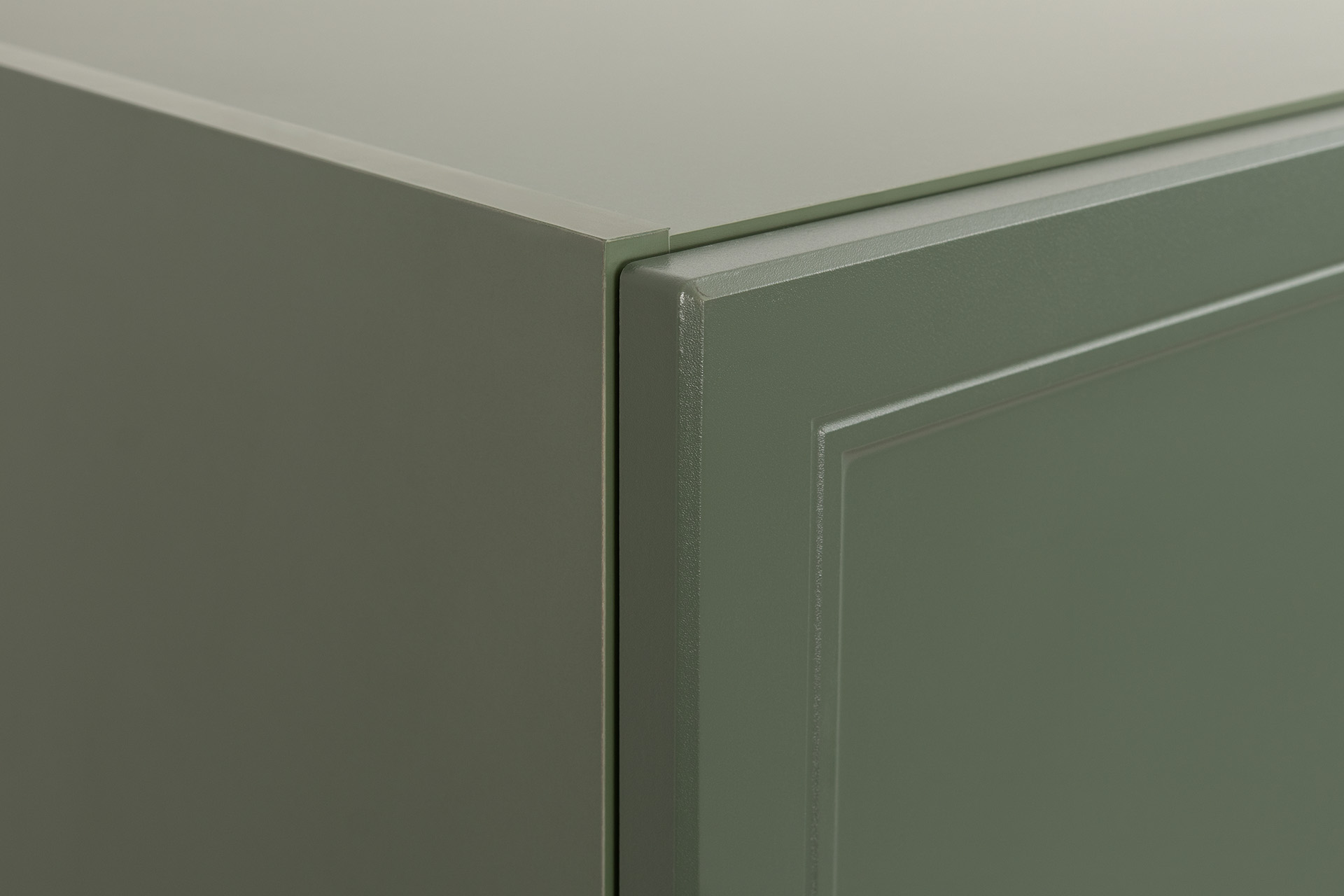 Изящные линии, глубокая фрезеровка фасадов из МДФ и благородные оттенки. Утончённая «Слоновая кость» и изысканная «Олива Шагрень» с глубоким зелёным тоном — создают атмосферу уюта, тепла и благородства. Металлические ручки и опоры золотого цвета придают мебели утончённый блеск, а петли и направляющие с доводчиками обеспечивают плавное и бесшумное закрытие фасадов.