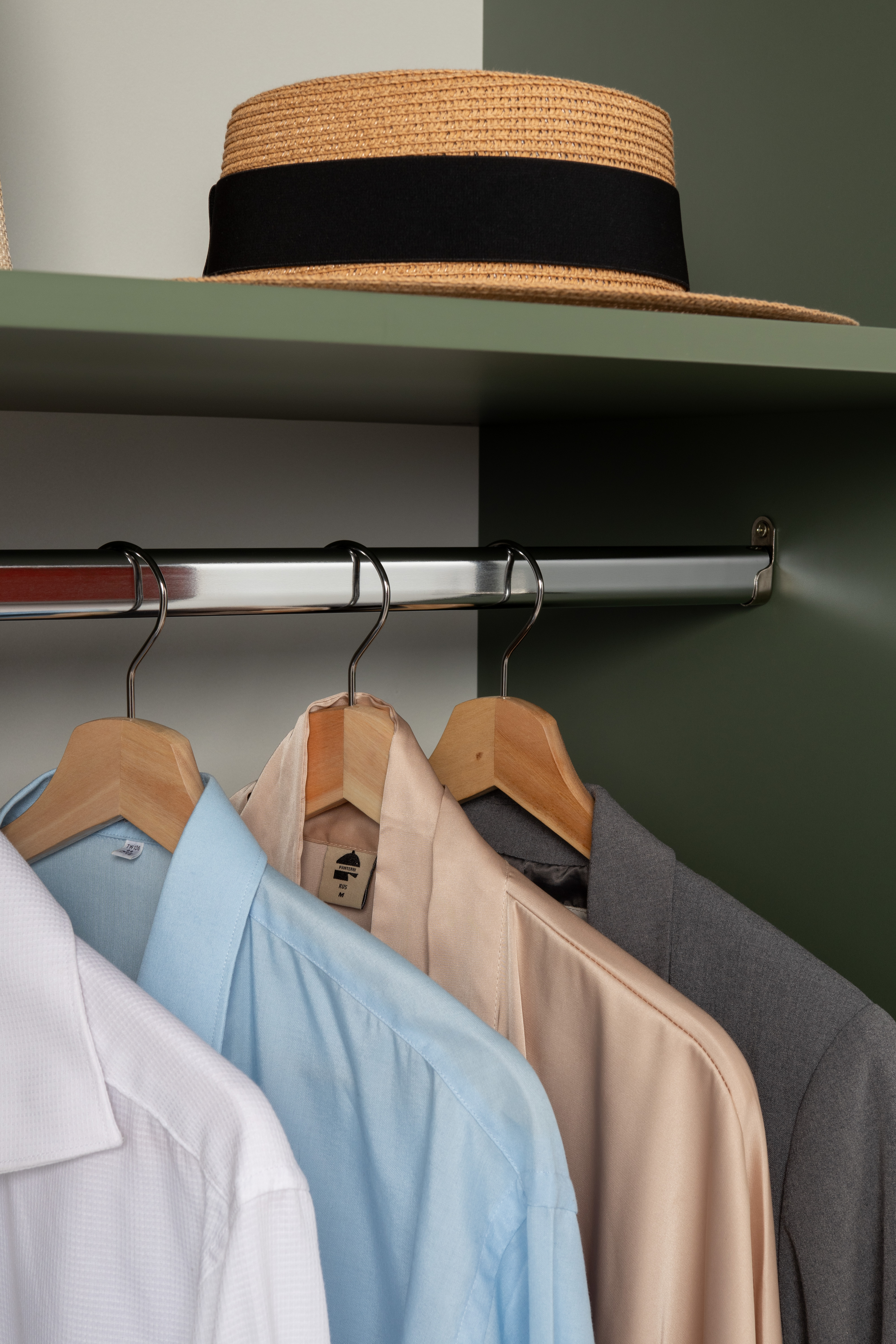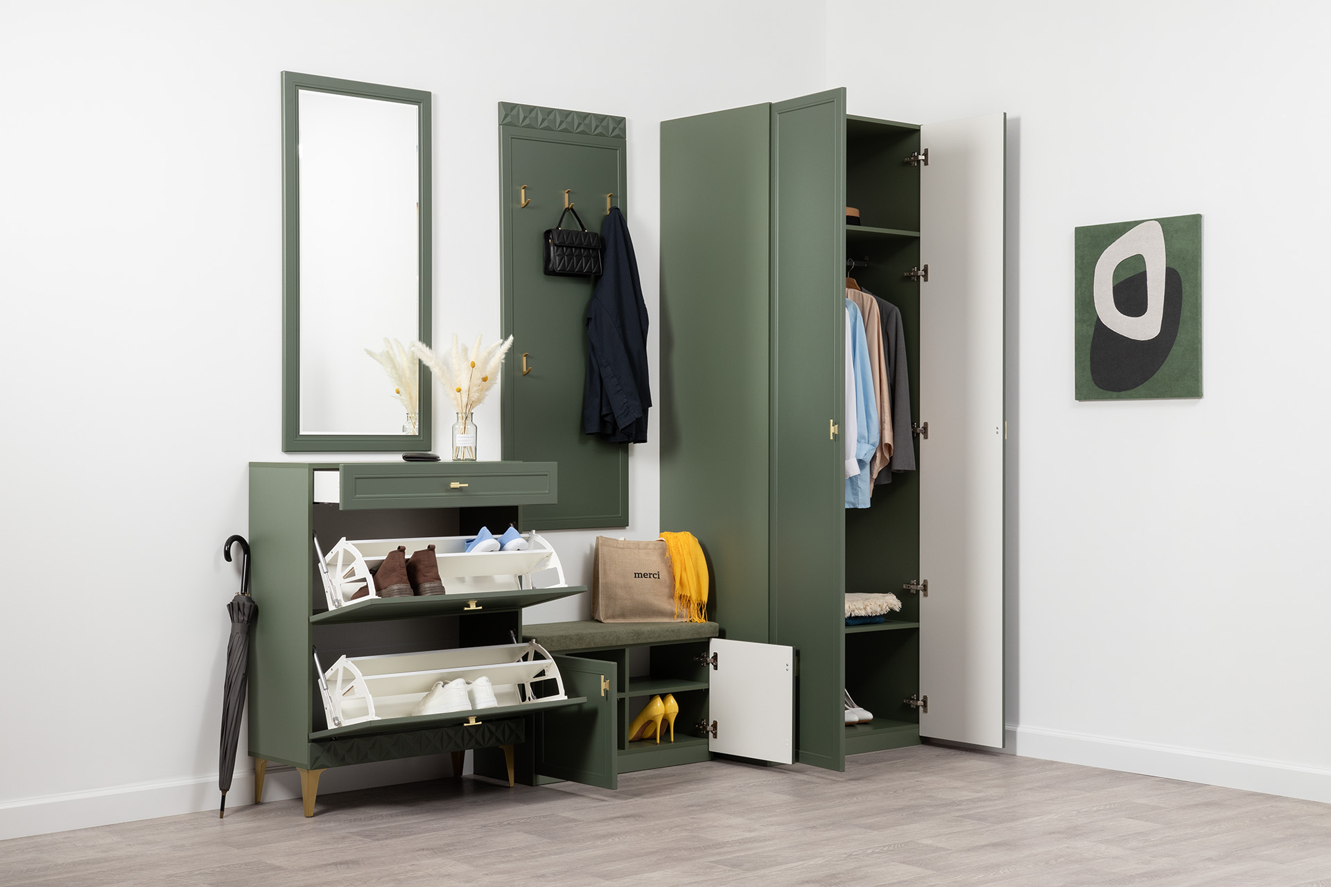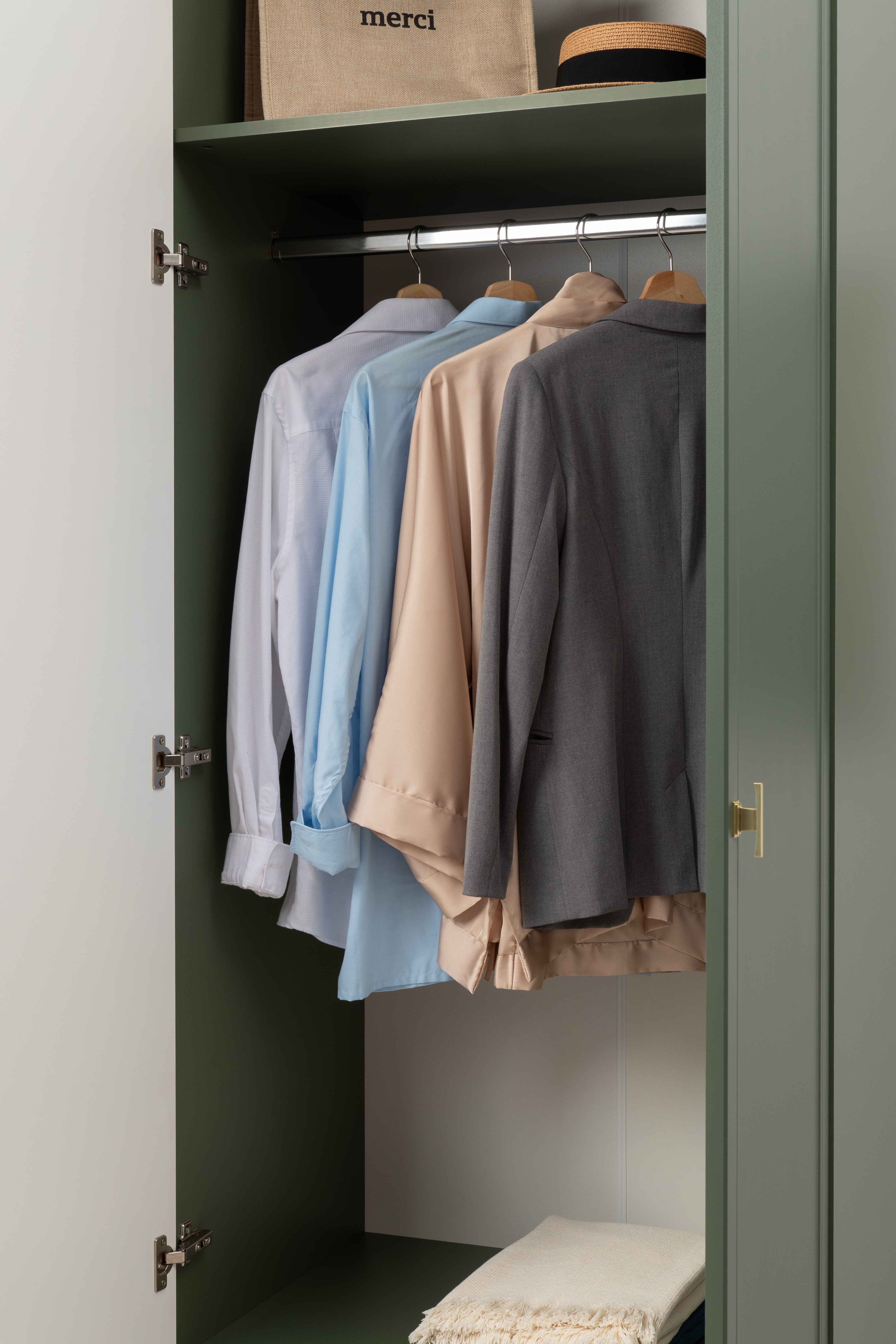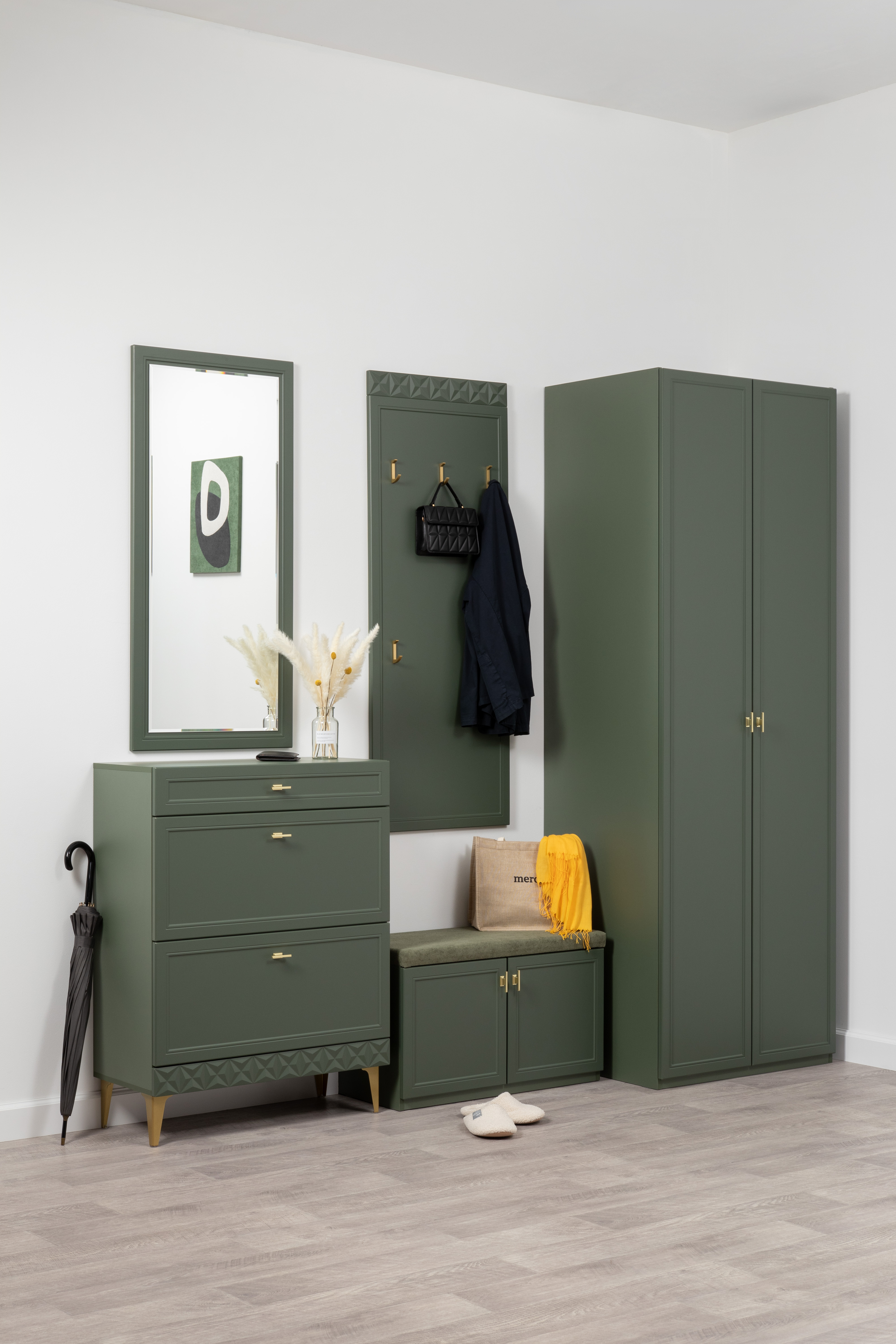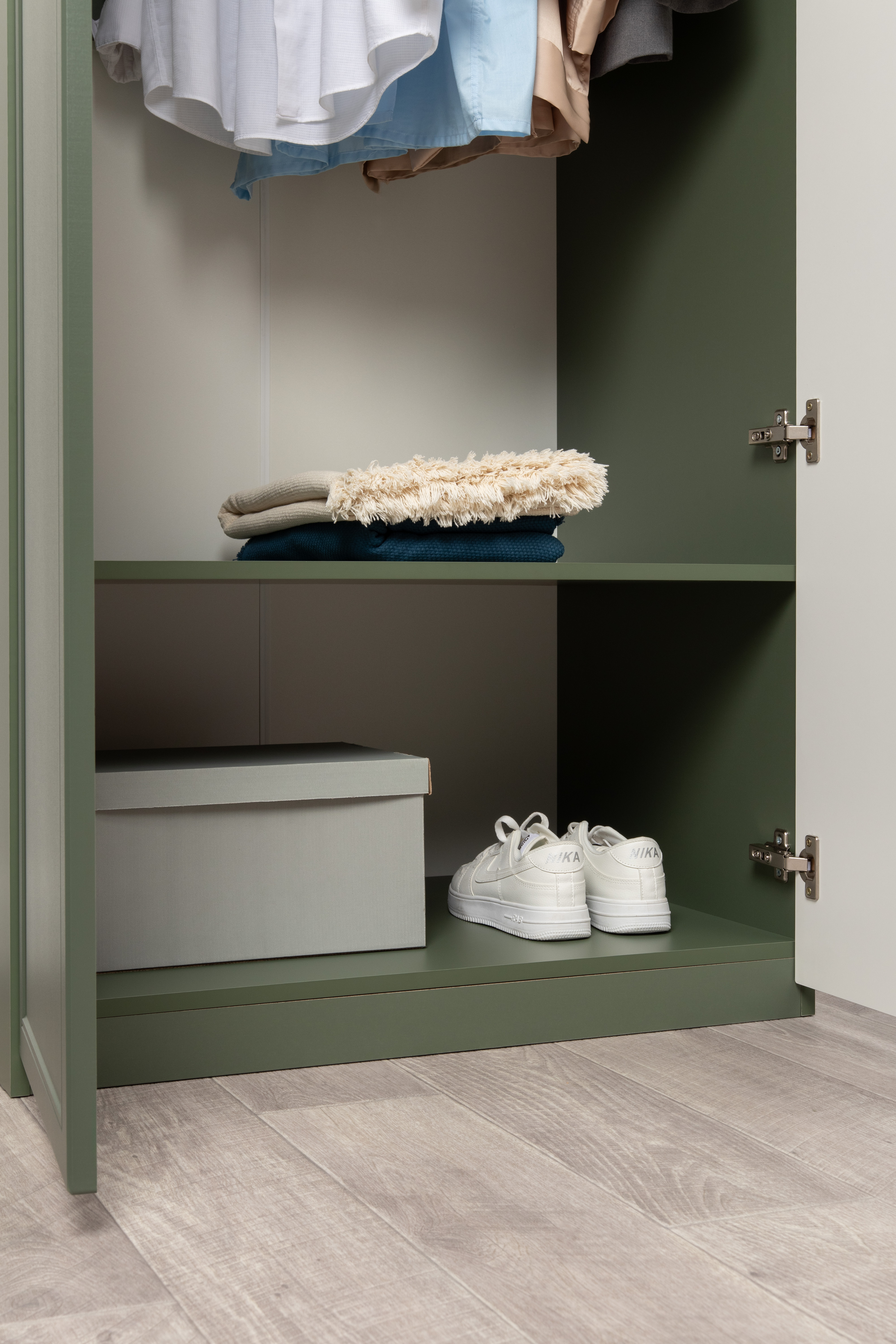 Изящные линии, глубокая фрезеровка фасадов из МДФ и благородные оттенки. Утончённая «Слоновая кость» и изысканная «Олива Шагрень» с глубоким зелёным тоном — создают атмосферу уюта, тепла и благородства. Металлические ручки и опоры золотого цвета придают мебели утончённый блеск, а петли и направляющие с доводчиками обеспечивают плавное и бесшумное закрытие фасадов.