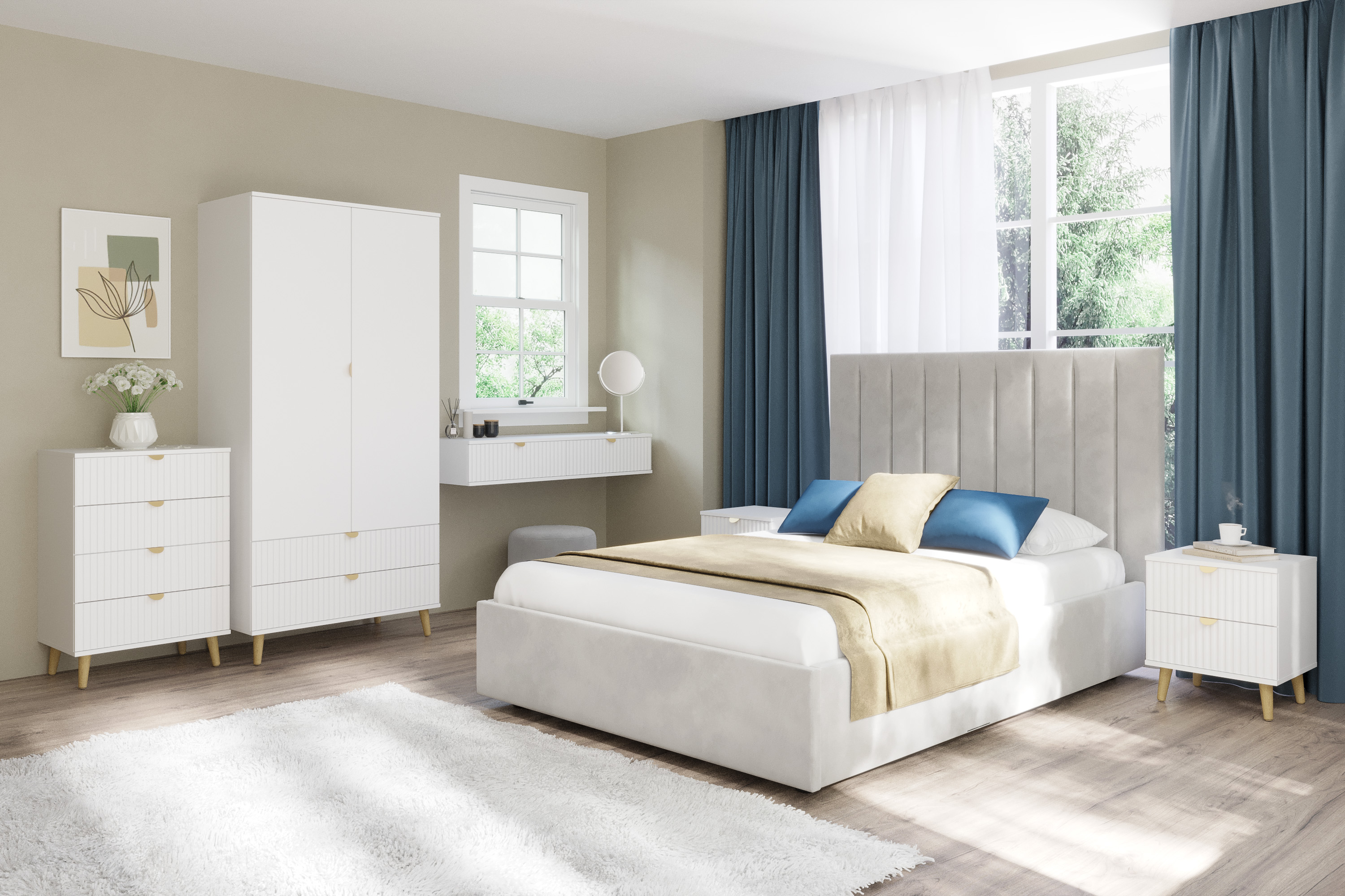 Модульная композиция включает 2 тумбы, оснащенные выдвижными ящиками, которые открываются плавно и бесшумно благодаря шариковым направляющим, комод и шкаф, в котором удобно организовать предметы одежды, при этом высокие опоры облегчают процесс уборки.